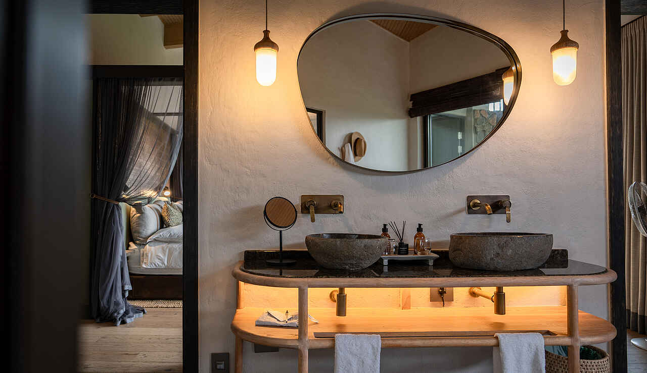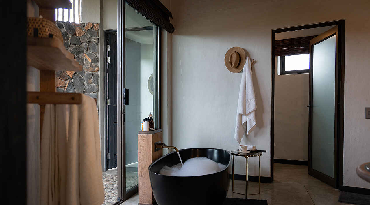 Das Schlafzimmer ist offen und hochwertig eingerichtet, mit komfortablem Doppelbett, Sitzmöbeln, Klimaanlage und ausreichend Stauraum. Große Fenster sorgen für viel Tageslicht und führen auf die Terrasse. Das En-suite-Badezimmer verfügt über Doppelwaschbecken, Innen- und Außendusche sowie eine freistehende Badewanne. Handtücher, Haartrockner und Pflegeprodukte stehen bereit. Eine Minibar sowie Kaffee und Teezubereitungsmöglichkeiten ergänzen die Ausstattung.