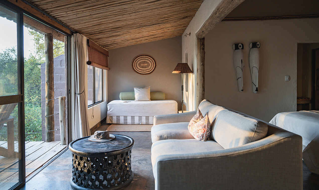 Die Mashatu Lodge verfügt über 14 elegant gestaltete Suiten, die alle einen beeindruckenden Ausblick auf eines der wertvollen Wasserlöcher des Reservats bieten. Jede klimatisierte Suite ist mit viel Liebe zum Detail eingerichtet und mit beeindruckenden Schwarz-Weiß-Fotografien von Afrikas schönsten Tieren dekoriert. Der großzügige Schlafbereich umfasst ein komfortables Doppelbett sowie ein zusätzliches Einzelbett - ideal für Familien oder Paare, die Wert auf zusätzlichen Raum legen.