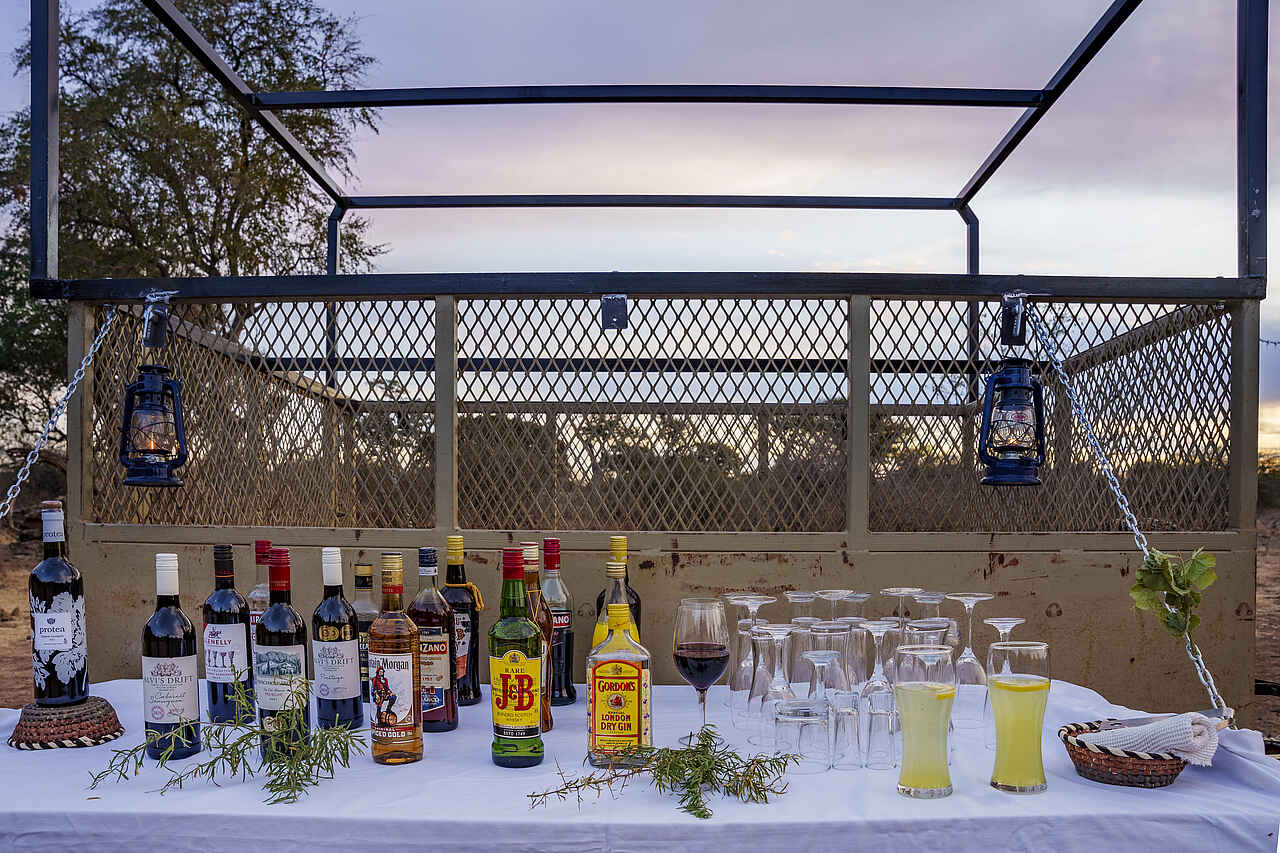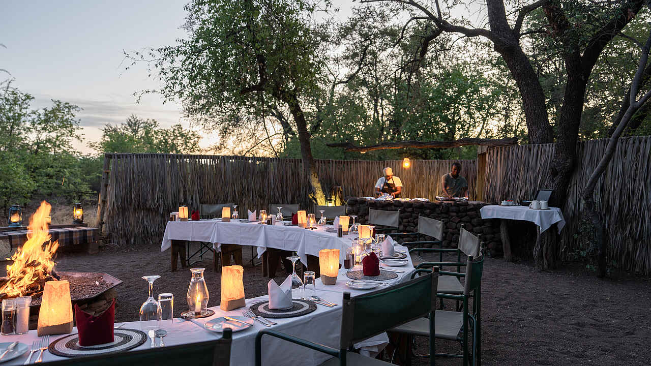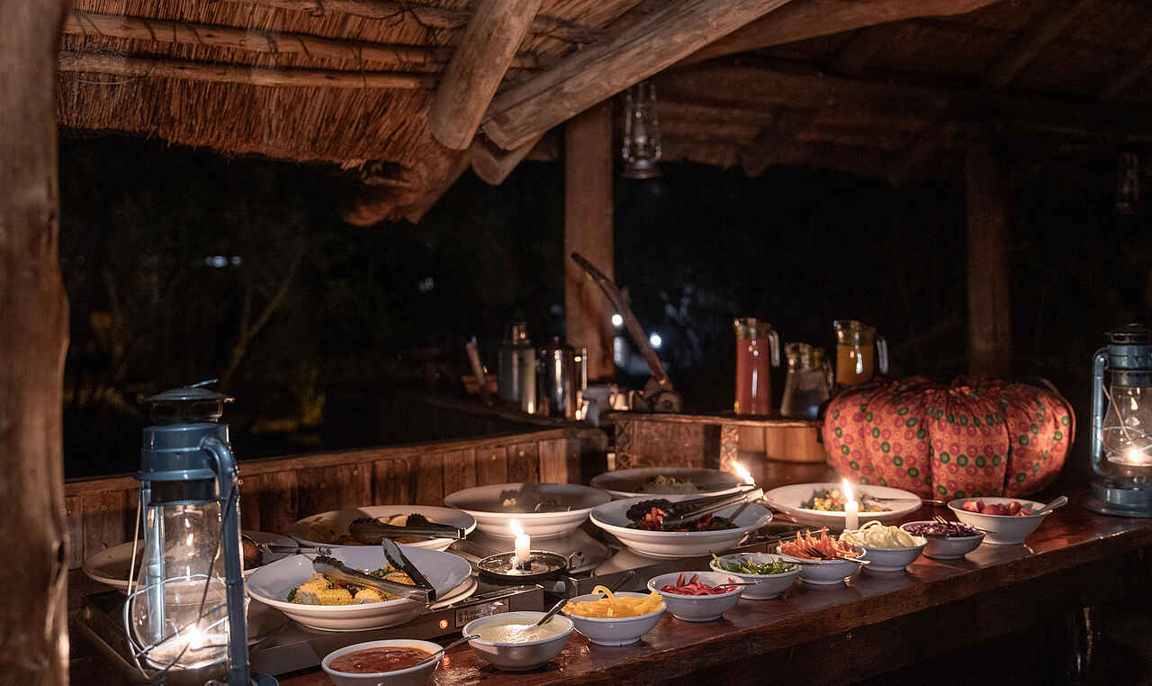 Die Mahlzeiten werden entweder auf der schattigen Terrasse oder in der Boma mit Blick auf das beleuchtete und gut besuchte Wasserloch eingenommen. Es gibt täglich frische, lokale und internationale Gerichte, die mit viel Liebe zubereitet werden. Gäste können sich auf eine abwechslungsreiche Küche freuen, die auf individuelle Wünsche und spezielle Ernährungsbedürfnisse eingeht, welche im Voraus angemeldet werden sollten. Alle Mahlzeiten und Getränke sind inklusive.