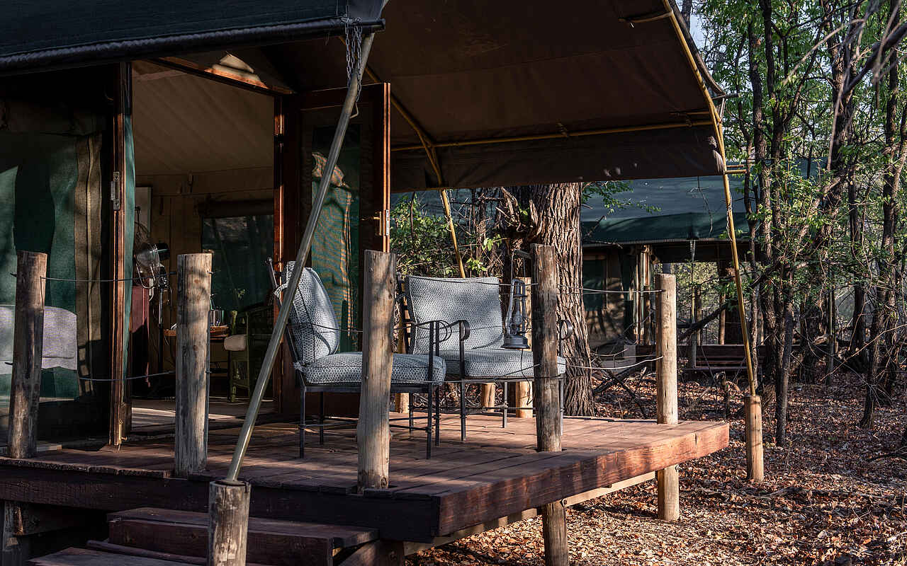 Die Gäste sind in geräumigen Zeltsuiten untergebracht, die auf Holzplattformen errichtet wurden. Jedes Zelt verfügt über ein eigenes Badezimmer mit heißem Wasser, einer Außendusche, einem Waschbecken und einem WC. Die Zelte sind mit komfortablen Kingsize- oder Einzelbetten, Moskitonetzen und Ventilatoren ausgestattet. Vor den Zelten befindet sich eine kleine Veranda, die zum Entspannen einlädt. Die Zelte bieten genügend Privatsphäre und sind so platziert, dass Gäste die Ruhe und die Geräusche der afrikanischen Wildnis genießen können.