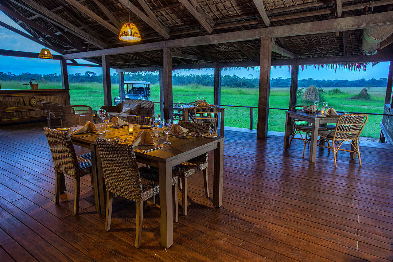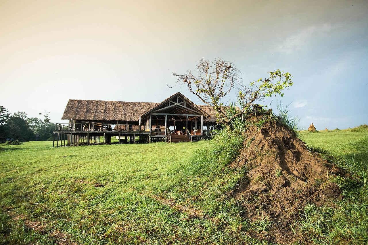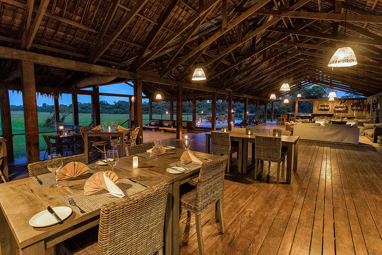 Die Hauptlodge ist ein großes, auf einer Holzplattform im offenen Grasland stehendes Langhaus mit Spitzdach. Es handelt sich um einen soliden Rahmen aus Kanthölzern, der landestypisch mit Bambuspalmwedeln gedeckt ist. Alles Seiten sind offen und geben den Blick auf die Umgebung frei. Die Hauptlodge beherbergt in einem durchgehenden Raum den Speisesaal, die Bar, die Lounge und die Aussichtsterrasse. Die Innenausstattung ist geprägt von dunklen Hölzern. Im geräumigen Speisesaal stehen mehrere Doppel- und Gruppentische. in der Lounge stehen mehrere Sitzgruppen, bestehend aus Polstersofas, Korb-Lehnsesseln und Kaffeetischen. Auf der Sonnenterrasse stehen ebenfalls mehrere Sitzgruppen aus Segeltuchfaltstühlen mit Lehne, Kaffeetischchen und Sonnenschirmen. Zudem befindet sich hier eine massive Feuerschale für Abendliche Lagefeuer. Einige Minuten entfernt am Fluss steht eine große Laube auf Holzplattform, die über das Ufer hinausreicht. Die Bauweise entspricht der Hauptlodge. Hier sind ebenfalls mehrere Tische und Sitzgruppen, sowie ein Grill. Elektrischer Strom mit Eurosteckern und WiFi vorhanden.