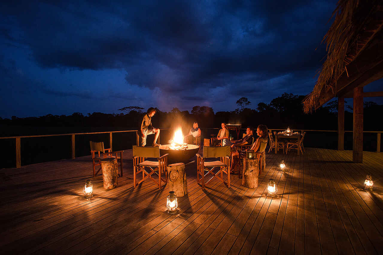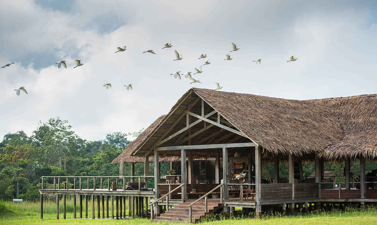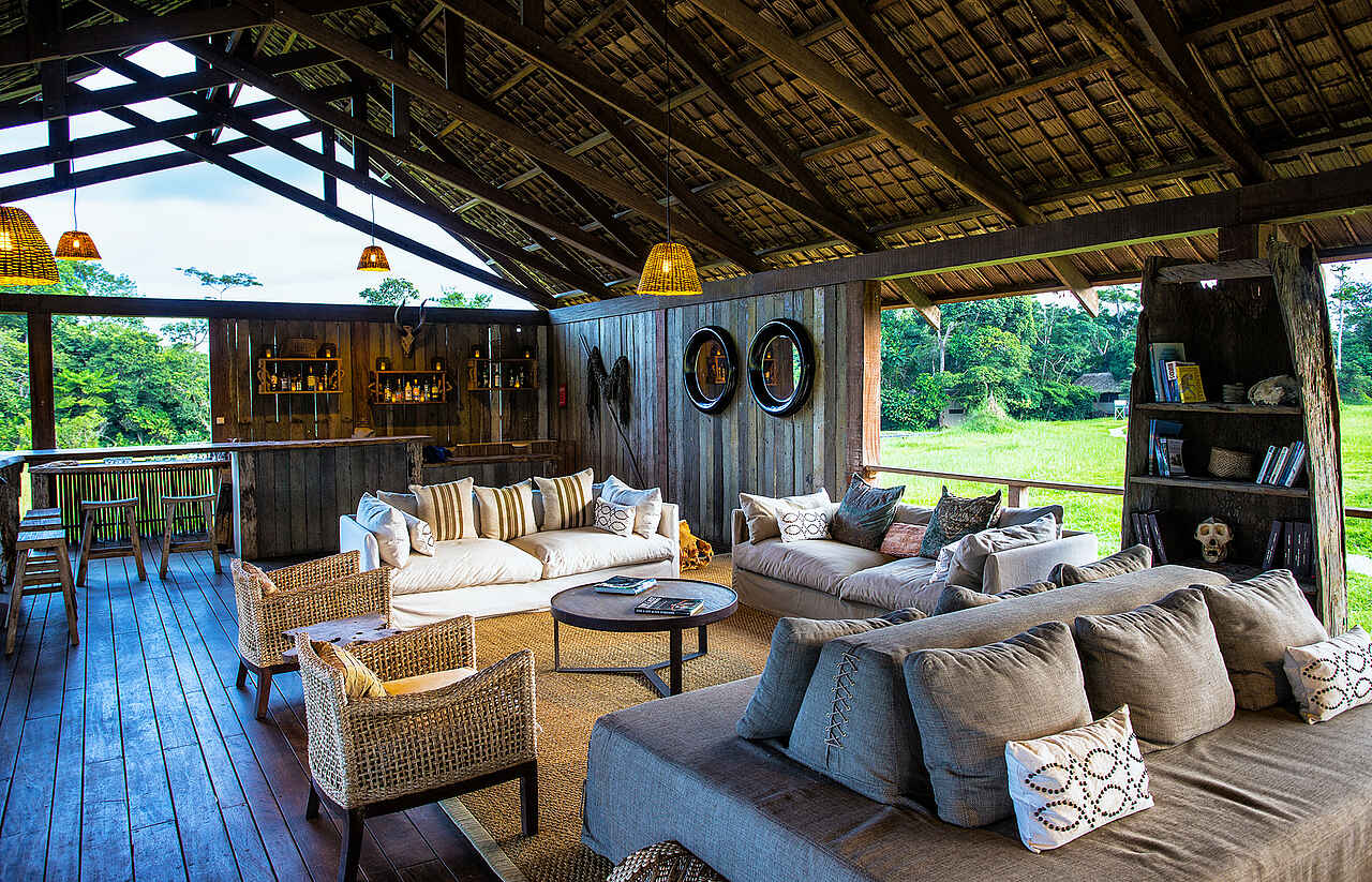 Die Hauptlodge ist ein großes, auf einer Holzplattform im offenen Grasland stehendes Langhaus mit Spitzdach. Es handelt sich um einen soliden Rahmen aus Kanthölzern, der landestypisch mit Bambuspalmwedeln gedeckt ist. Alles Seiten sind offen und geben den Blick auf die Umgebung frei. Die Hauptlodge beherbergt in einem durchgehenden Raum den Speisesaal, die Bar, die Lounge und die Aussichtsterrasse. Die Innenausstattung ist geprägt von dunklen Hölzern. Im geräumigen Speisesaal stehen mehrere Doppel- und Gruppentische. in der Lounge stehen mehrere Sitzgruppen, bestehend aus Polstersofas, Korb-Lehnsesseln und Kaffeetischen. Auf der Sonnenterrasse stehen ebenfalls mehrere Sitzgruppen aus Segeltuchfaltstühlen mit Lehne, Kaffeetischchen und Sonnenschirmen. Zudem befindet sich hier eine massive Feuerschale für Abendliche Lagefeuer. Einige Minuten entfernt am Fluss steht eine große Laube auf Holzplattform, die über das Ufer hinausreicht. Die Bauweise entspricht der Hauptlodge. Hier sind ebenfalls mehrere Tische und Sitzgruppen, sowie ein Grill. Elektrischer Strom mit Eurosteckern und WiFi vorhanden.