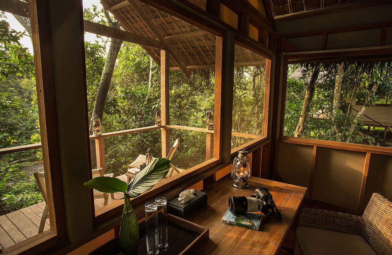 Ca. 100 Meter entfernt von der Hauptlodge verteilen sich die 12 Gästeunterkünfte entlang der Waldkante im Abstand von ca. 15-20 Metern. Es handelt sich um auf Holzplattformen errichtete solide Rahmen aus Kanthölzern mit dicker Segeltuchbespannung und hohem Spitzdach mit der omnipräsenten Bambuspalmwedeldecke. Der Zugang erfolgt über eine Veranda mit Blick auf den nahen Fluss im Wald. Hier stehen 2 Segeltuchklappstühle mit Cocktailtischen. Die Innenausstattung besteht aus entweder einem Kingsize-Bett oder einem Doppelbett, je unter einem großen Moskitonetz, nebst 2 Nachtischen. Richtung Fluss steht zudem ein großer Schreibtisch mit heller Holzplatte und einem Korblehnstuhl. Mehrere große Fenster mit Gardinen lassen viel Licht herein. Insgesamt dominieren beigefarben-helle oder rötlich-braune Holztöne die Szenerie. Hinter einer übermannshohen Trennwand aus Holzplanken befindet sich die Dusche, die Waschbecken und die Toilette. Fließend Warm- und Kaltwasser sowie elektrischer Strom vorhanden. Wäscheservice wird angeboten in Form von Handwäsche. Die Trocknung an der frischen Luft benötigt ca. 1-2 Tage.