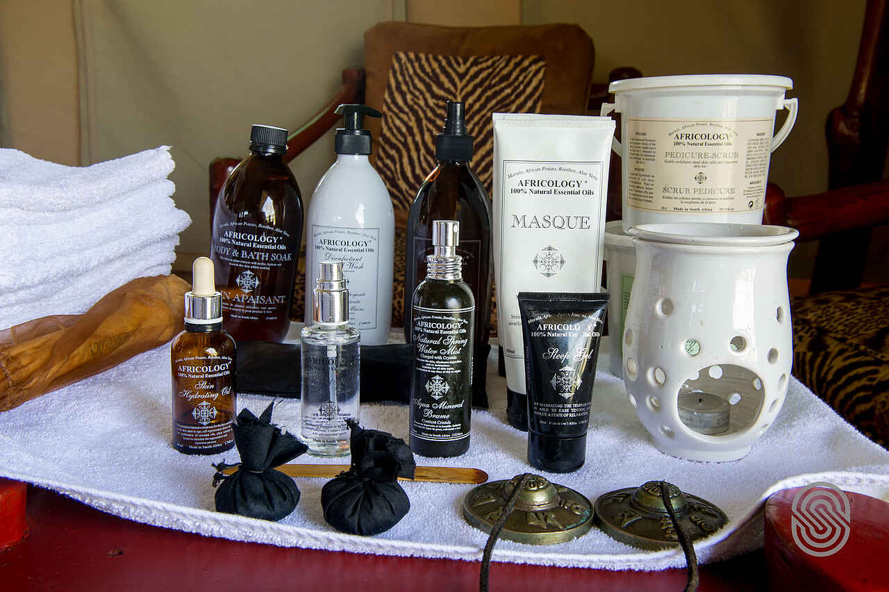 Im zentralen Bereich des Camp befindet sich ein weitläufiges, zu den Seiten hin offenes Zelt, in dem die Lounge, eine kleine Bar und der Souvenirshop untergebracht sind. Gepolsterte Sitzgruppen aus Treibholz, Ziegelwände und Holzstreben unter dem Zeltdach verbreiten ein behagliches und zugleich luftiges Flair. In einem weiteren Zelt ist das Restaurant untergebracht.