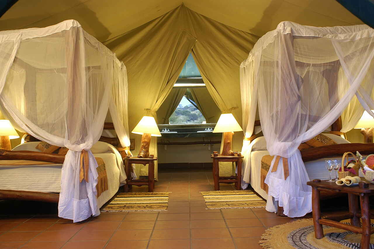Die Gäste sind in 16 großzügigen Schlafzelten untergebracht, die über en-suite-Badezimmer mit Toilette und Dusche verfügen. Die Außenwände aus Leinen lassen sich nach Wunsch an den Seiten hochbinden. Die Einrichtung ist einfach, aber geschmackvoll und besteht aus zwei Einzelbetten mit Moskitonetz, Holzmöbeln und gewebten Teppichen. Vom Schlafzimmer aus gelangt man auf die mit Sitzmöbeln ausgestattete Veranda.