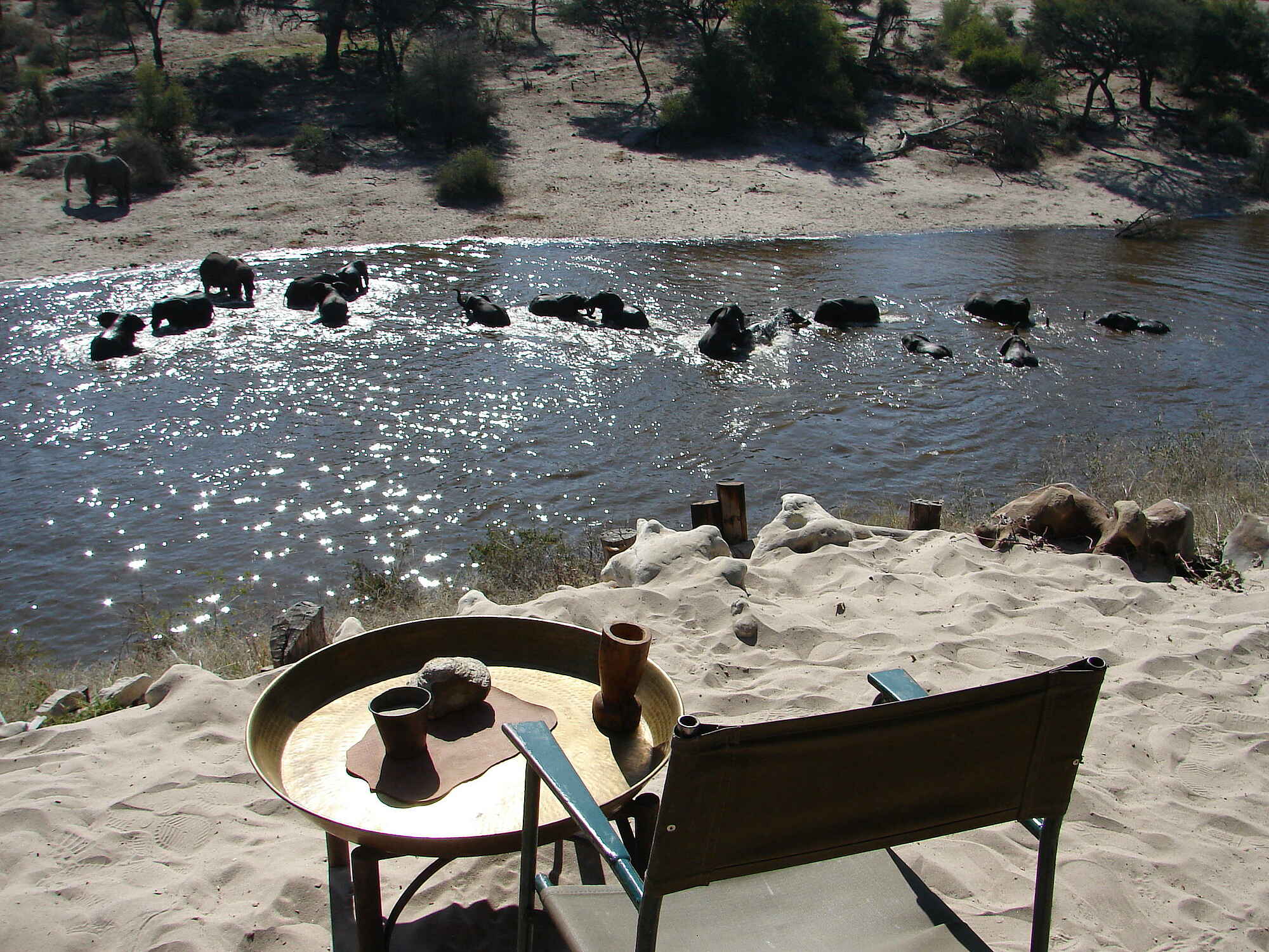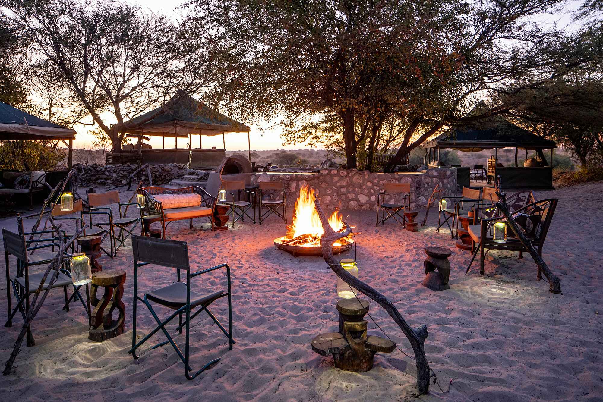 Der zentrale Bereich des Camps besteht aus einem offenen Lounge- und Essbereich mit Blick über das Flusstal. Bequeme Sitzflächen, natürliche Materialien und eine entspannte Atmosphäre schaffen einen Ort zum Zurücklehnen und Beobachten. Ein Felspool mit weitem Blick über den Boteti River bildet das Herzstück des Camps für ruhige Stunden zwischen Safaris. Abends trifft man sich an der Boma für Gespräche und Sundowner unter dem Sternenhimmel. Eine kleine Bibliothek, ein Shop sowie eine schwimmende Beobachtungsplattform am Fluss ergänzen die Anlage. Von dort aus lässt sich das Geschehen am Wasser unmittelbar verfolgen, oft ohne das Camp überhaupt verlassen zu müssen.