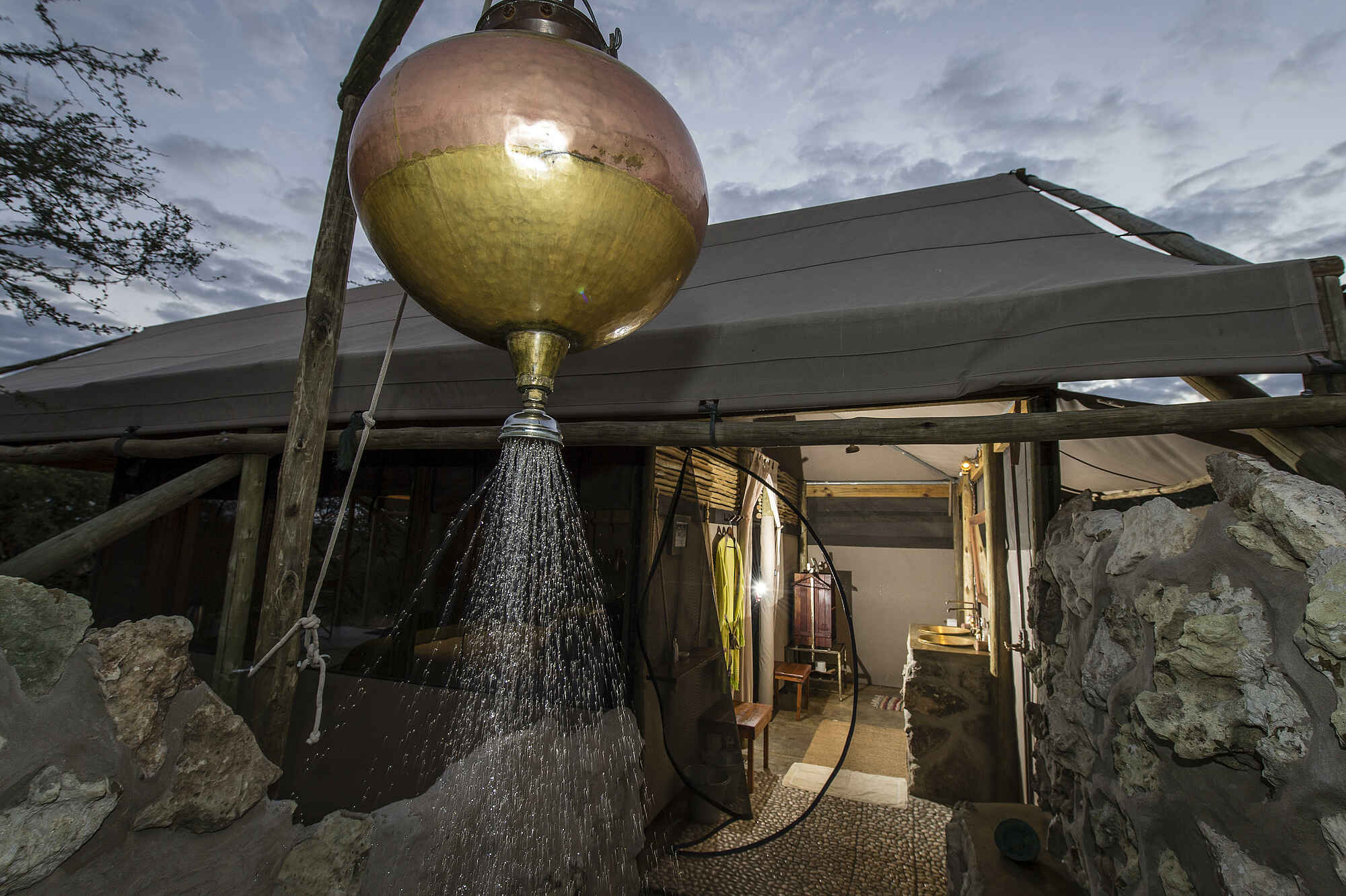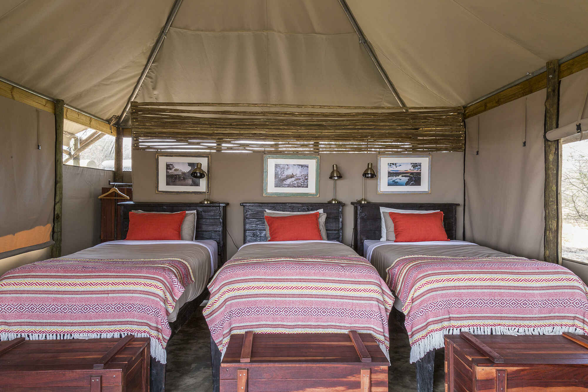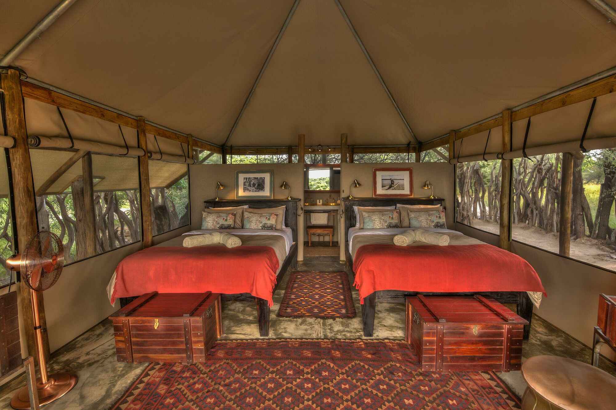 Die zehn Zelte liegen entlang der Klippenkante und bieten freien Blick auf den Fluss. Die Einrichtung ist klassisch afrikanisch angehaucht mit Holz, Kelimteppichen, natürlichen Farben und ausgewählten Dekorationen. Zur Ausstattung gehören bequeme Betten, genügend Stauraum, Sitzmöbel und eine Veranda mit Liegeflächen für Tierbeobachtung direkt vom Zelt. Jedes Zelt verfügt über ein En-suite-Badezimmer mit Toilette, Dusche und zusätzlicher Dusche im Freien. Die beiden Familienzelte bestehen aus verbundenen Schlafbereichen mit Platz für mehrere Personen.