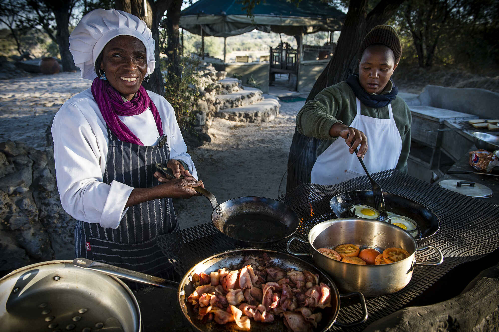 Gegessen wird gemeinsam im offenen Essbereich oder unter freiem Himmel. Die Küche ist bodenständig und geschmackvoll mit regionalen Einflüssen. Serviert werden frische Gerichte, oft mit Grillkomponenten, Eintöpfen, Gemüse und hausgemachten Desserts. Frühstück, Mittagessen und Abendessen sind inklusive, ebenso ausgewählte Getränke. Lunchpakete und Picknicks begleiten längere Safaris.