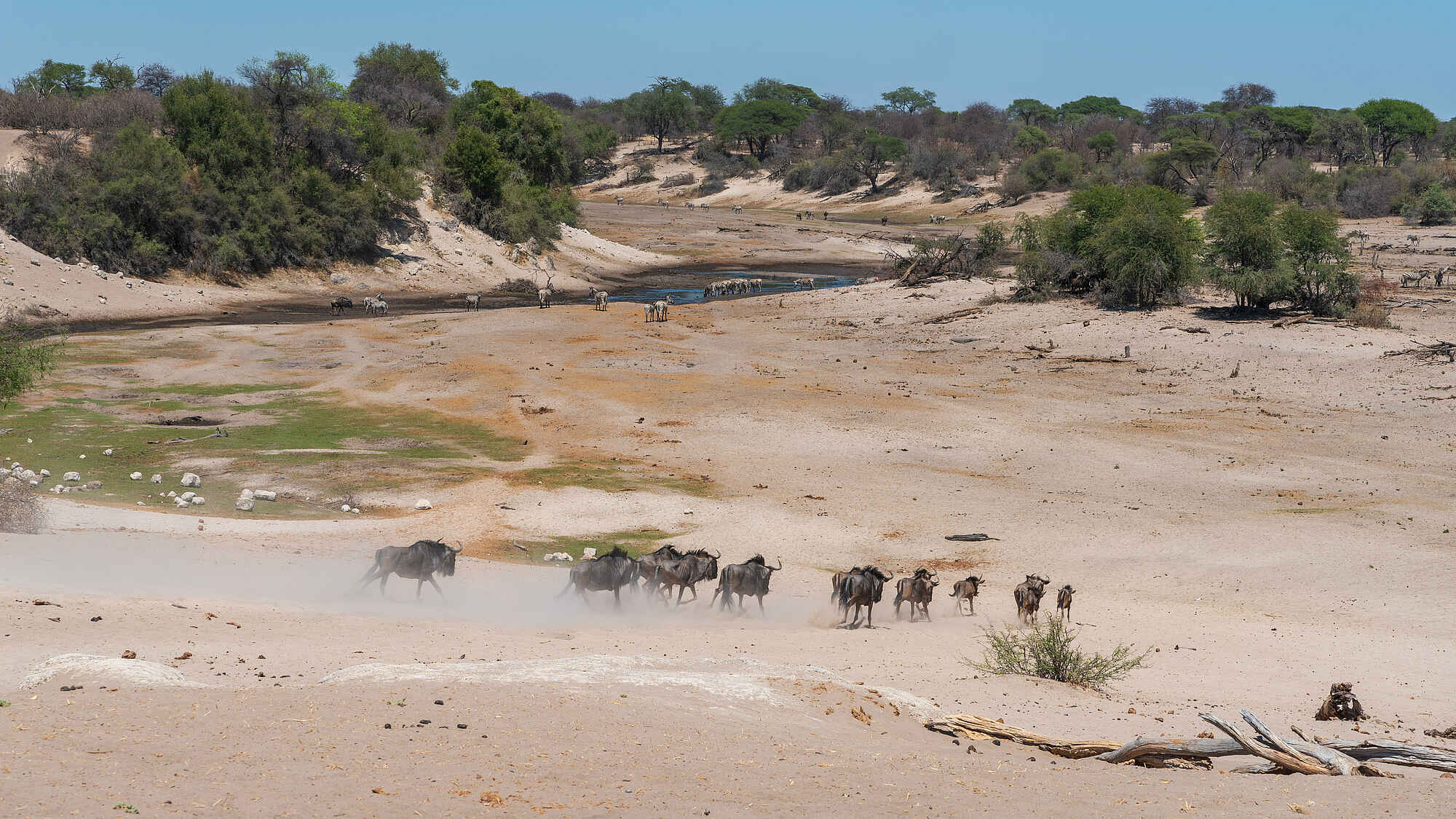 Meno a Kwena Camp liegt in Botswana am Rand der Makgadikgadi Region, oberhalb des Boteti River mit weitem Blick über das Flusstal. Die Lage auf einer Anhöhe eröffnet einen ungehinderten Panoramablick auf die Uferzone, an der regelmäßig Elefanten, Zebras und verschiedene Antilopen erscheinen. Während der Trockenzeit entfaltet sich hier ein besonders eindrucksvolles Naturschauspiel, wenn sich große Zebra und Gnuherden am Wasser sammeln und weiterziehen, oft dicht gefolgt von Raubtieren. Das Camp steht für ein authentisches Safarierlebnis, das durch Weite, Ruhe und unmittelbare Tierbegegnung getragen wird.