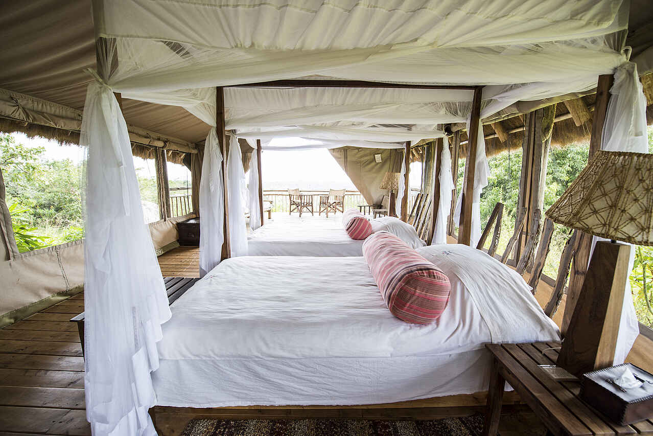 Die Mihingo Lodge verfügt über 12 komfortable und geräumige Safari-Zelte, die den Gästen Privatsphäre und Ruhe bieten. Jedes Zimmer hat seinen ganz eigenen Charme und Charakter, egal ob es sich im Wald befindet, mit Blick auf den See, auf einem Felsvorsprung, oder mit Blick auf das Wasserloch. Obwohl jedes der Zimmer einen eigenen Charakter hat, haben alle eine wunderbare Aussicht und bieten den Gästen das Gefühl, allein im Busch zu sein. Jedes geräumige Zelt aus Canvasmaterial verfügt über ein eigenes Bad mit fließendem warmem und kaltem Wasser, Dusche und Toilette. Die Zimmer wurden aus lokalen Materialien erbaut und sind mit viel Liebe zum Detail möbliert und dekoriert. Die Außenwände spiegeln die Farben des afrikanischen Bodens wider, sodass sich die Zimmer perfekt in die Natur eingliedern. Alle Lichter in den Zelten sowie der Warmwasserbereiter sind solarbetrieben.