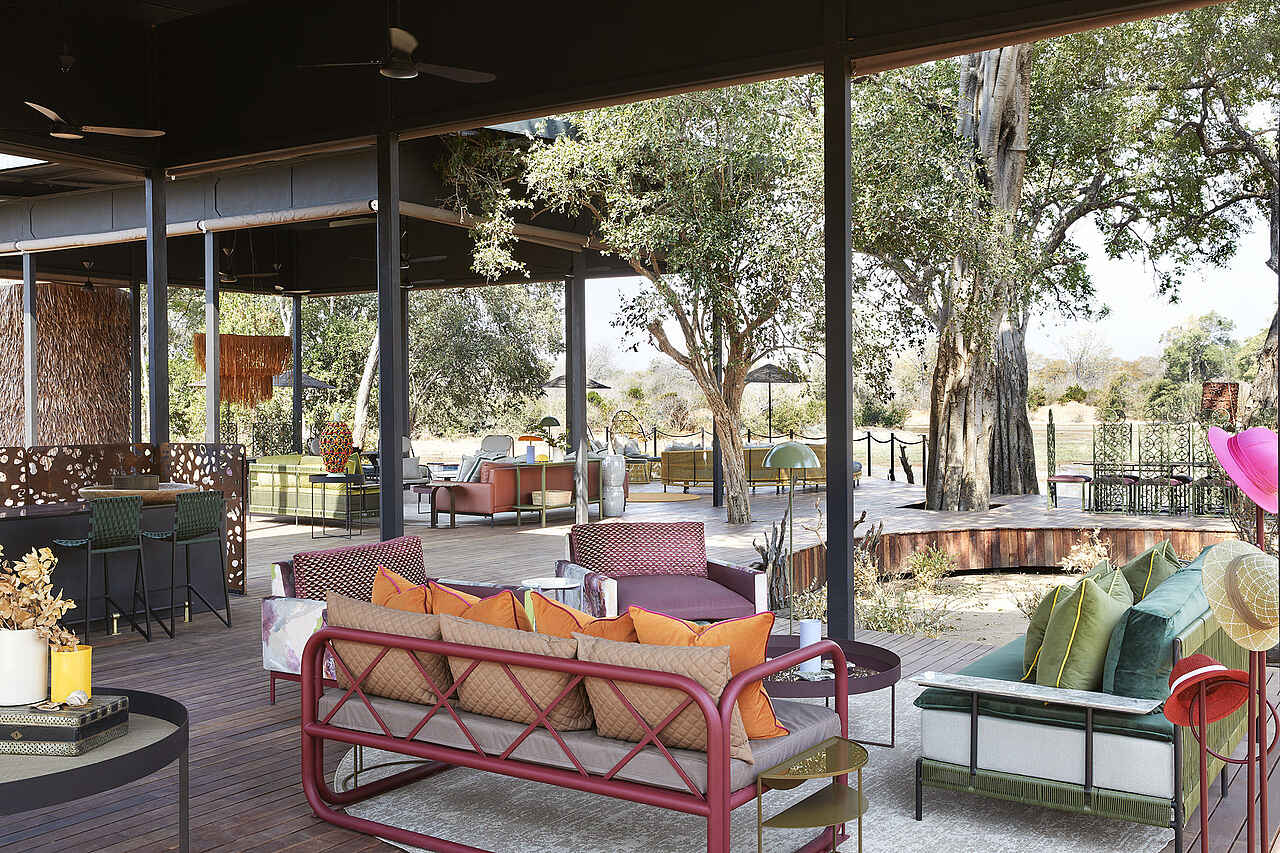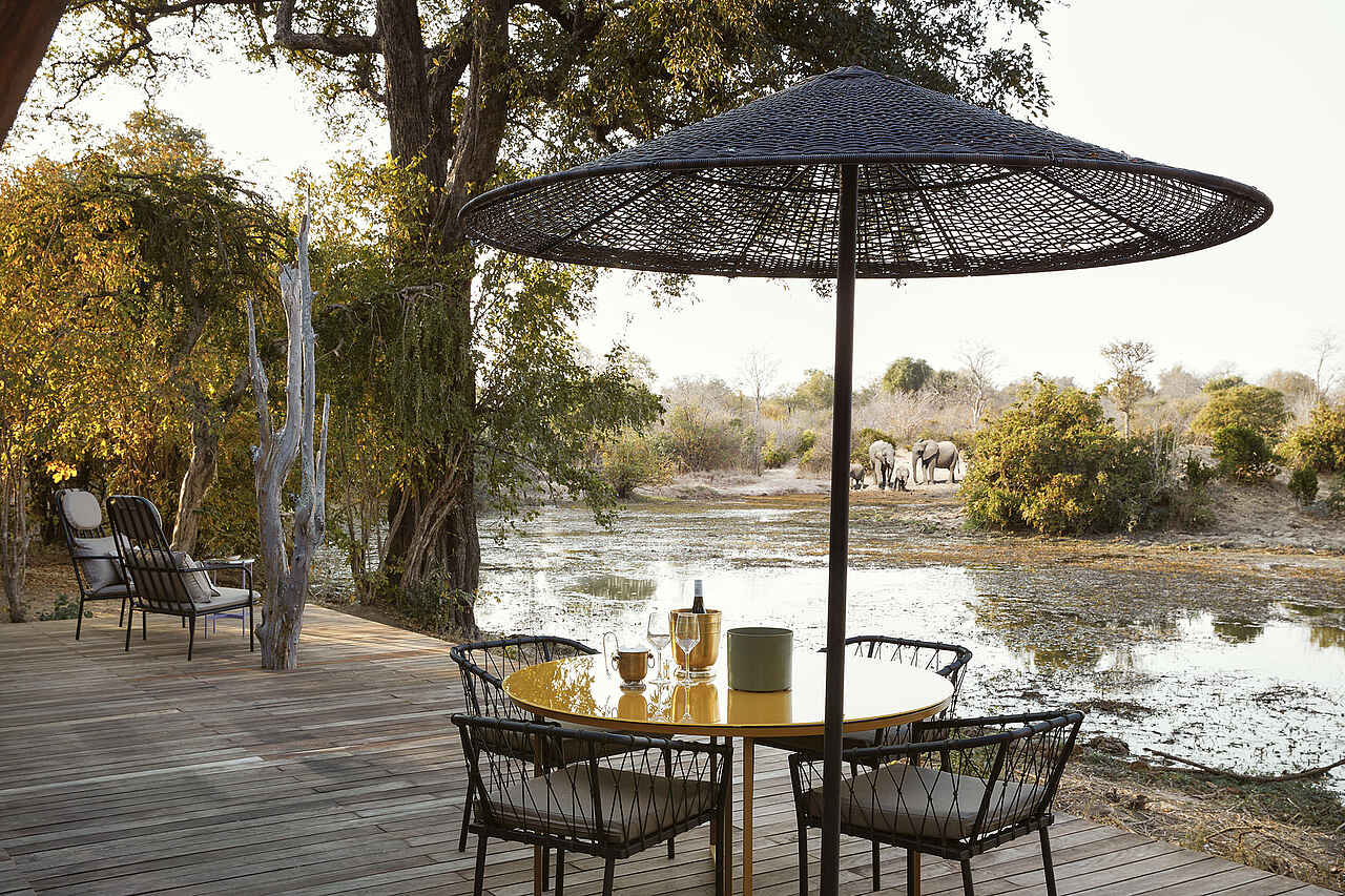 Der zentrale Bereich des Molori Mashuma Luxury Tented Camp bietet eine offene Lounge mit tiefen Sofas und Sesseln, ausgerichtet auf die Mashuma Pan. Eine erhöhte Holzterrasse erweitert den Aufenthaltsraum ins Freie und bietet tagsüber gute Chancen auf Sichtungen. Der Essbereich ist überdacht und wird bei passenden Bedingungen ins Freie verlegt. Die Bar hält Kaffee, Tee und ausgewählte Getränke bereit. Der Pool sorgt an warmen Tagen für Abkühlung und eröffnet eine zusätzliche Perspektive auf Elefanten, Büffel und Antilopen. Abends trifft man sich an der Feuerstelle, um Erlebnisse des Tages zu teilen und den Safaritag unter dem Sternenhimmel ausklingen zu lassen.