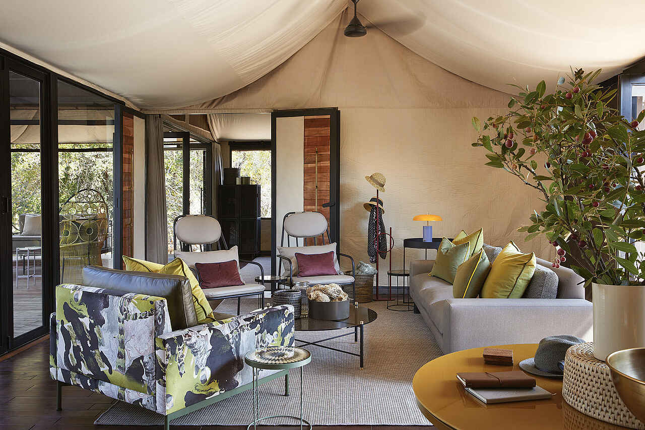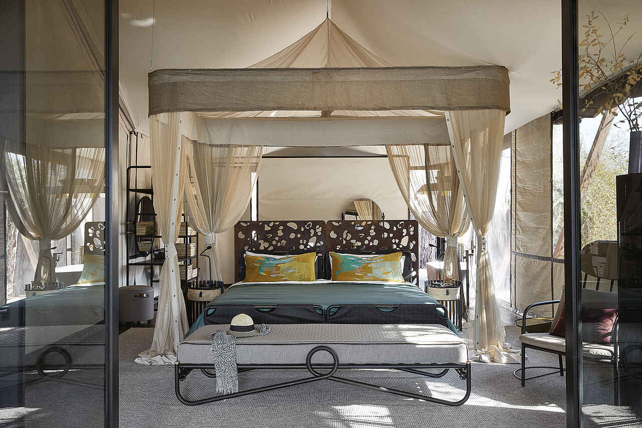 Die sechs Zeltsuiten des Molori Mashuma Luxury Tented Camp sind in zwei Kategorien unterteilt: vier Premier Tented Suites für zwei Personen und zwei Villa-Style Suites für bis zu vier Gäste. Bodentiefe Fenster bringen viel Tageslicht in den Wohnraum und geben den Blick auf die Mashuma Pan frei. Komfortable Betten mit Moskitonetzen fördern erholsame Nächte, während eine Klimaanlage angenehme Temperaturen schafft. Eine gemütliche Sitzecke, ausreichend Stauraum sowie Minibar und Kaffee- und Teestation stehen ganztägig bereit.