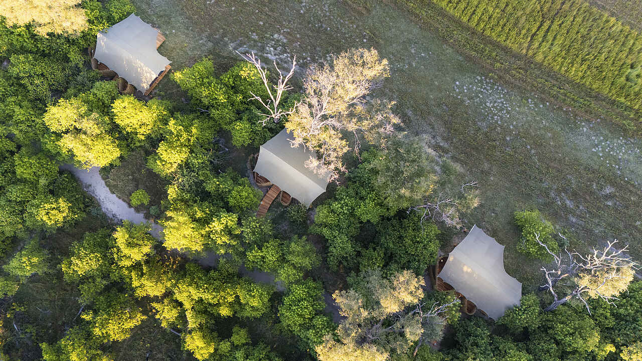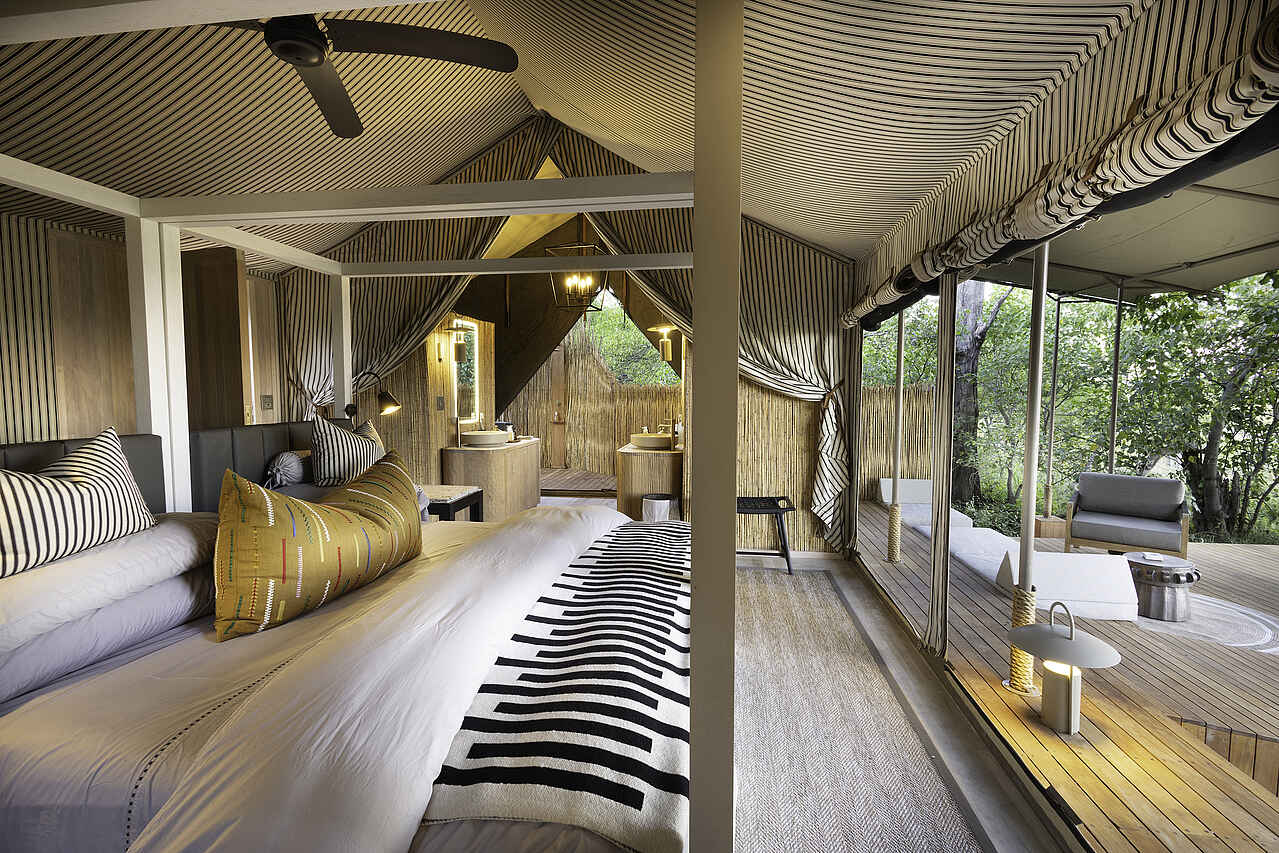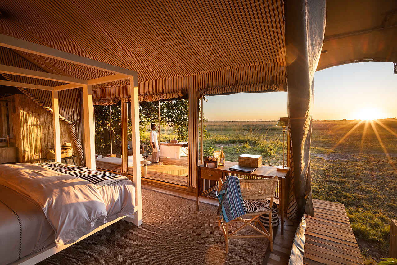 Die 10 Zeltsuiten im Monachira Camp sind geschmackvoll eingerichtet, wobei die Gestaltung der Zelte von traditionellen afrikanischen Safaris inspiriert wurde, was sich in den verwendeten Stoffen, Texturen und Farbtönen widerspiegelt. Jede Suite ist mit komfortablen Betten (wahlweise Kingsize- oder zwei Einzelbetten) und einen Deckenventilator über den Betten ausgestattet. Die En-suite-Badezimmer verfügen über Doppelwaschbecken, WC, Innen- und Außenduschen sowie lokal produzierte Toilettenartikel. Vor jedem Zelt befindet sich eine Veranda mit bequemen Sesseln, von der aus man eine fantastische Aussicht auf die Überschwemmungsebenen genießen kann. Die beiden Familienzelte bieten zwei separate Schlafbereiche, jeweils mit eigenem En-suite-Badezimmer. Zudem steht WLAN in allen Unterkünften zur Verfügung.
