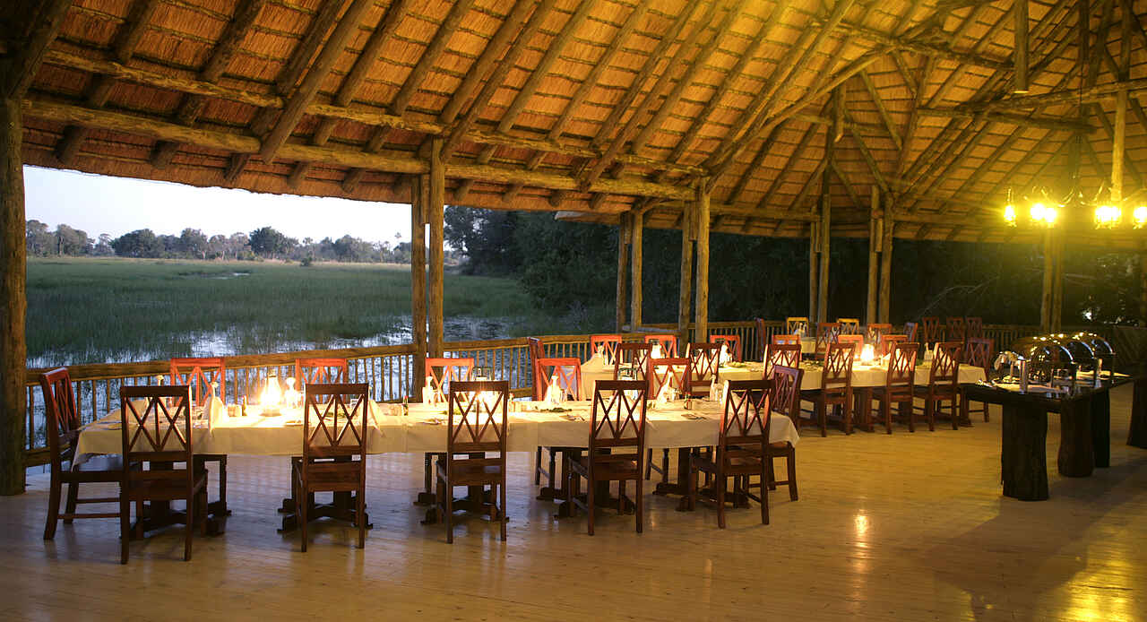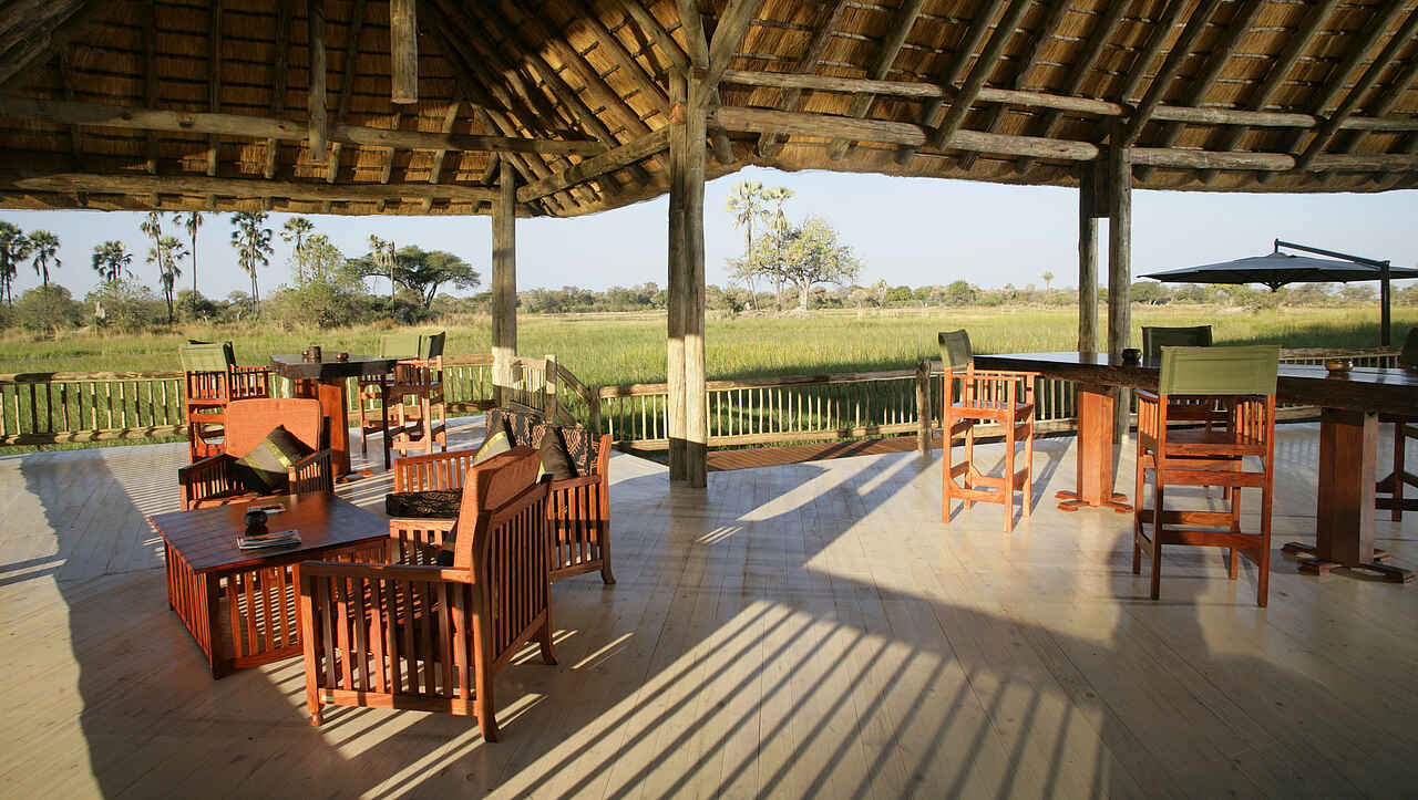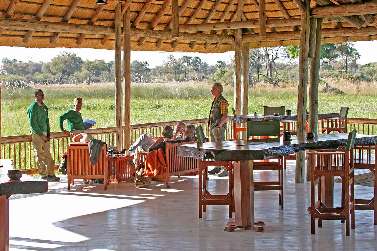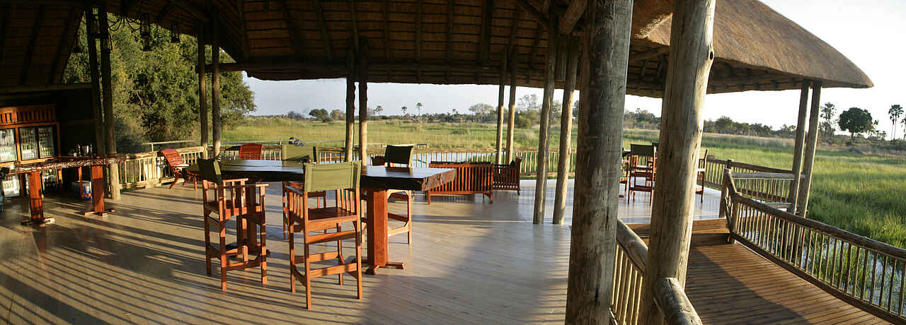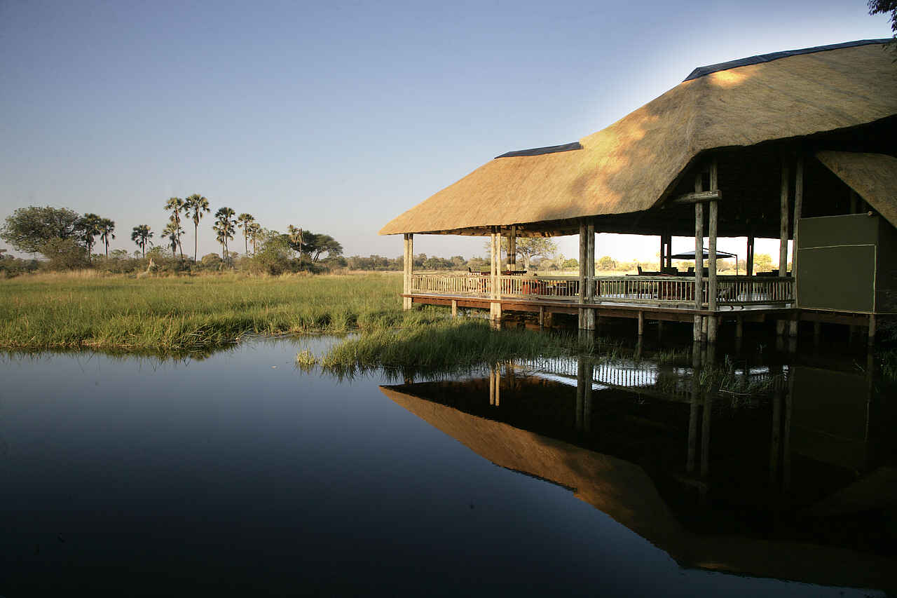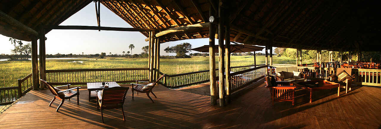 Halbmondförmiges Hauptgebäude am Schilfsaum des Boro-River, nach drei Seiten offen konstruiert, auf verschiedenen, leicht abgestuften Ebenen mit Blick über den Fluss zum Chief’s Island. Im Schatten der Bäume ein offenes Deck, dahinter der Pool. Mit Souvenirshop.