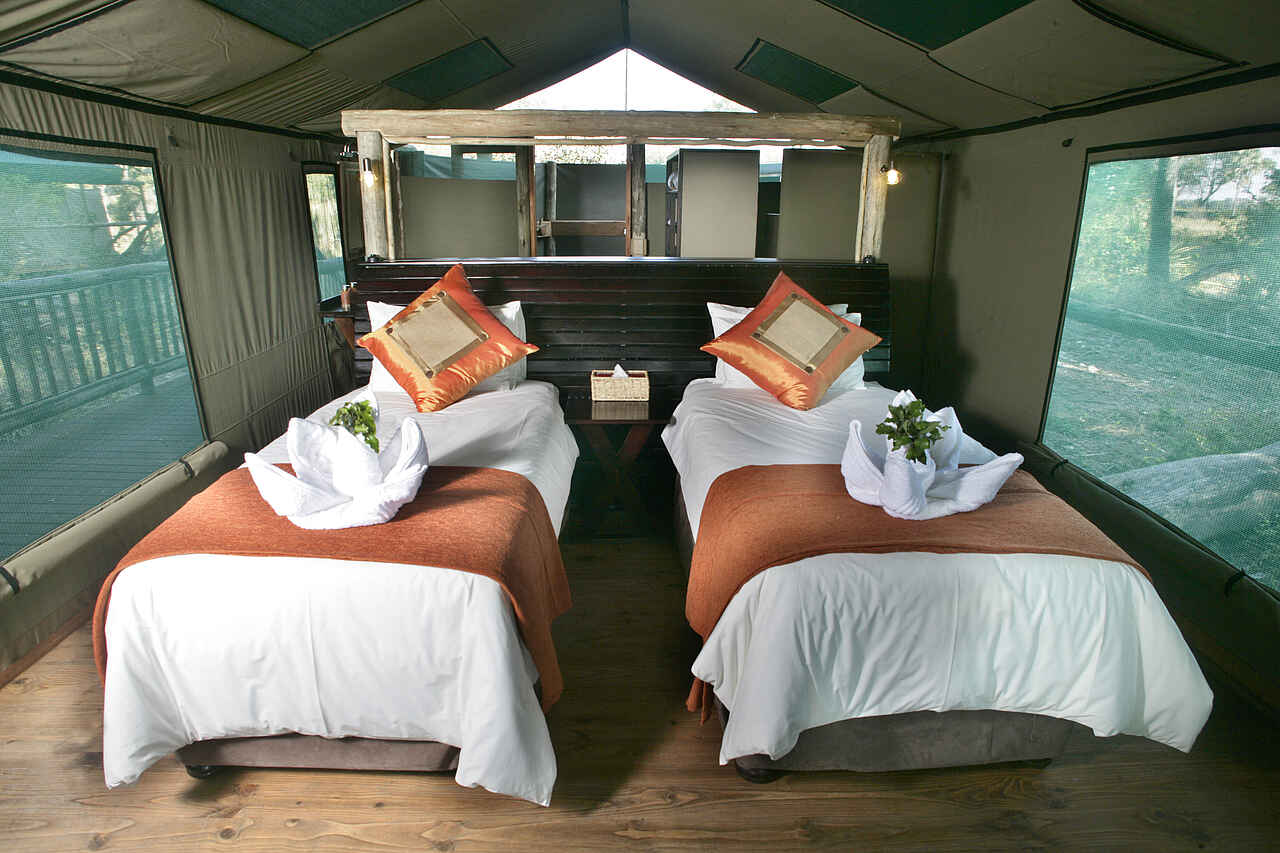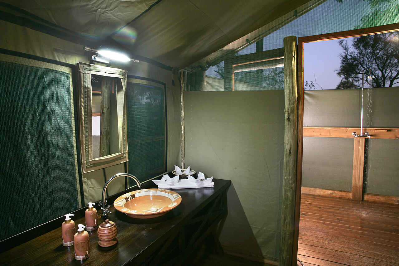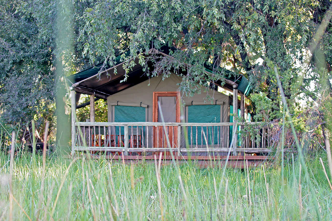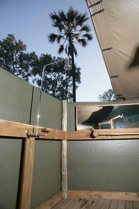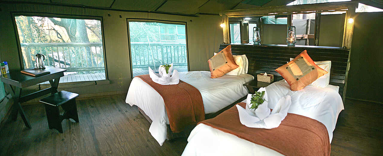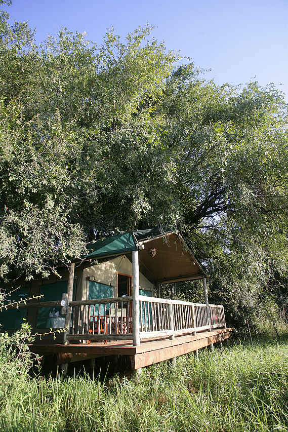 Gästezelte am Galeriewald im Schatten der hohen Bäume, alle mit privater Veranda und Blick über den Boro. Alle Zelte mit Waschbecken, Dusche, WC und fließend Kalt- und Warmwasser, ein Familienzelt mit insgesamt 4 Betten.