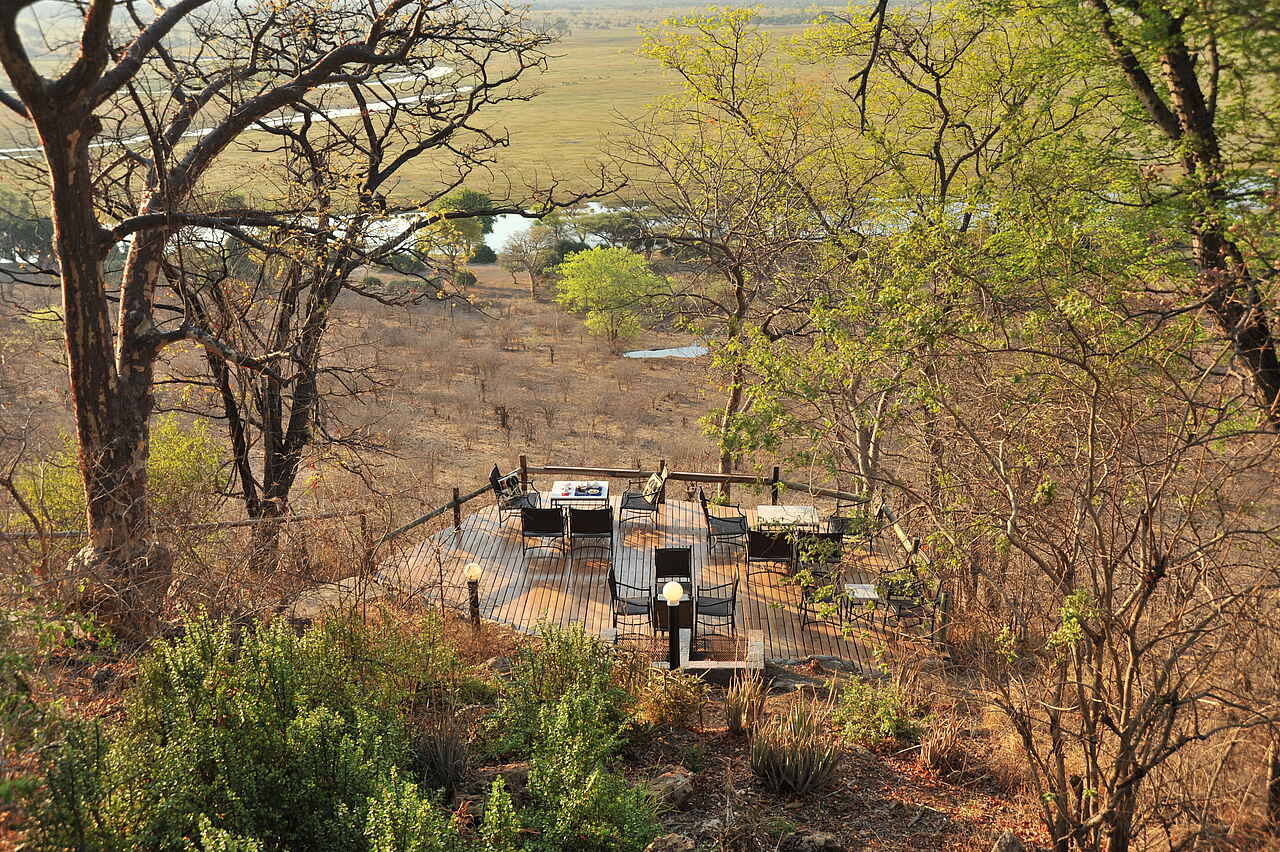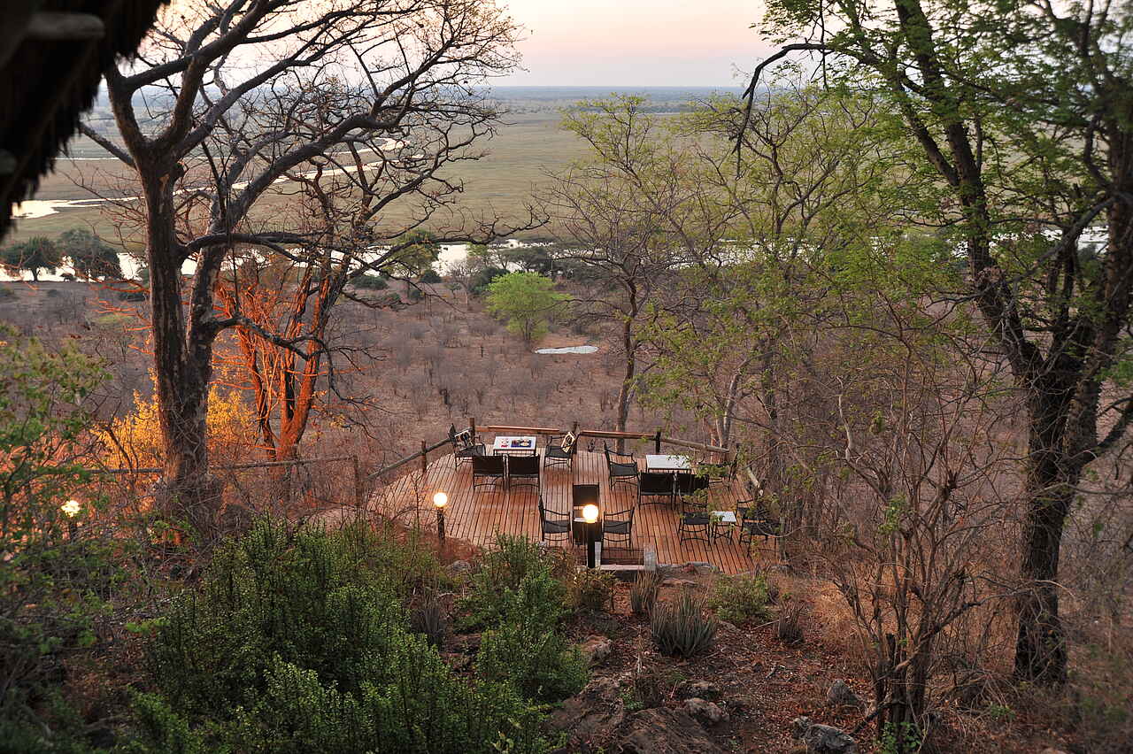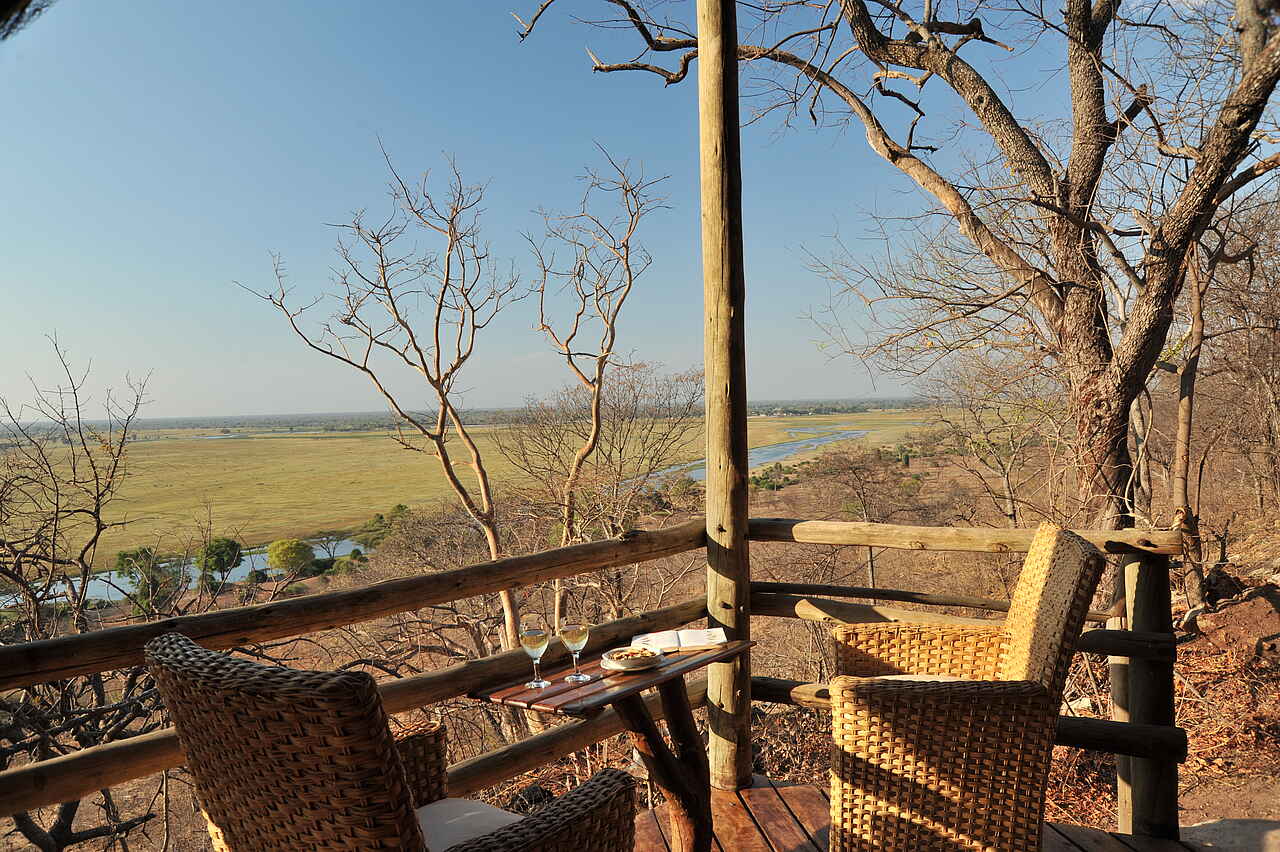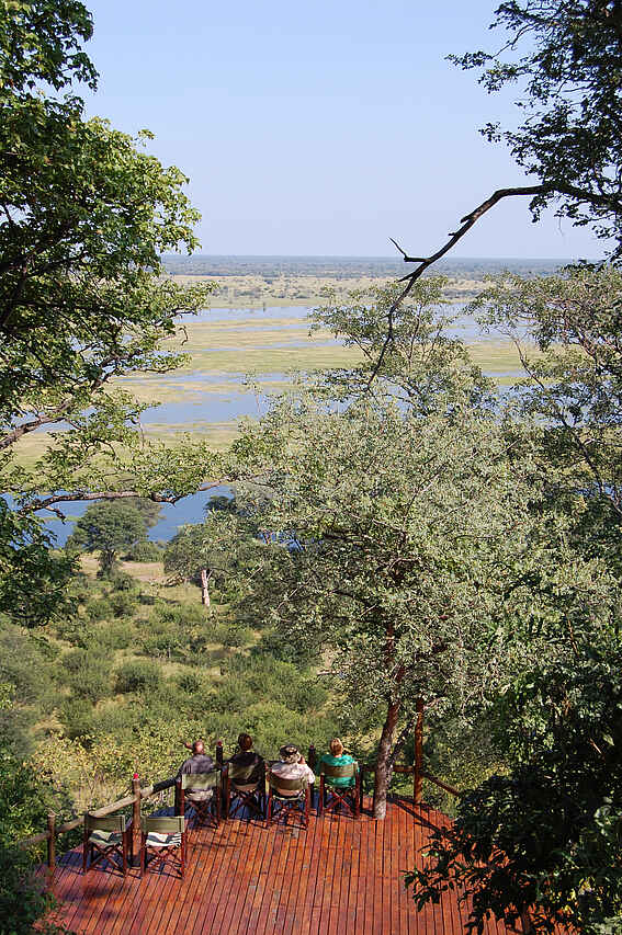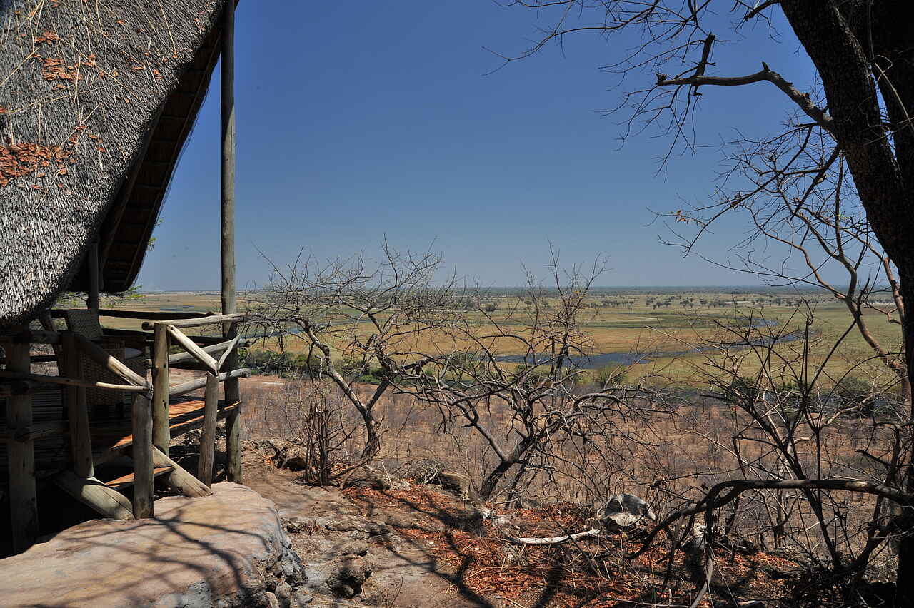 Die Muchenje Safari Lodge liegt an einem Steilhang über dem Chobe River und besticht durch ihren wunderschönen Ausblick. Der Chobe National Park präsentiert sich hier auf der westlichen Seite deutlich ruhiger als in Kasane.