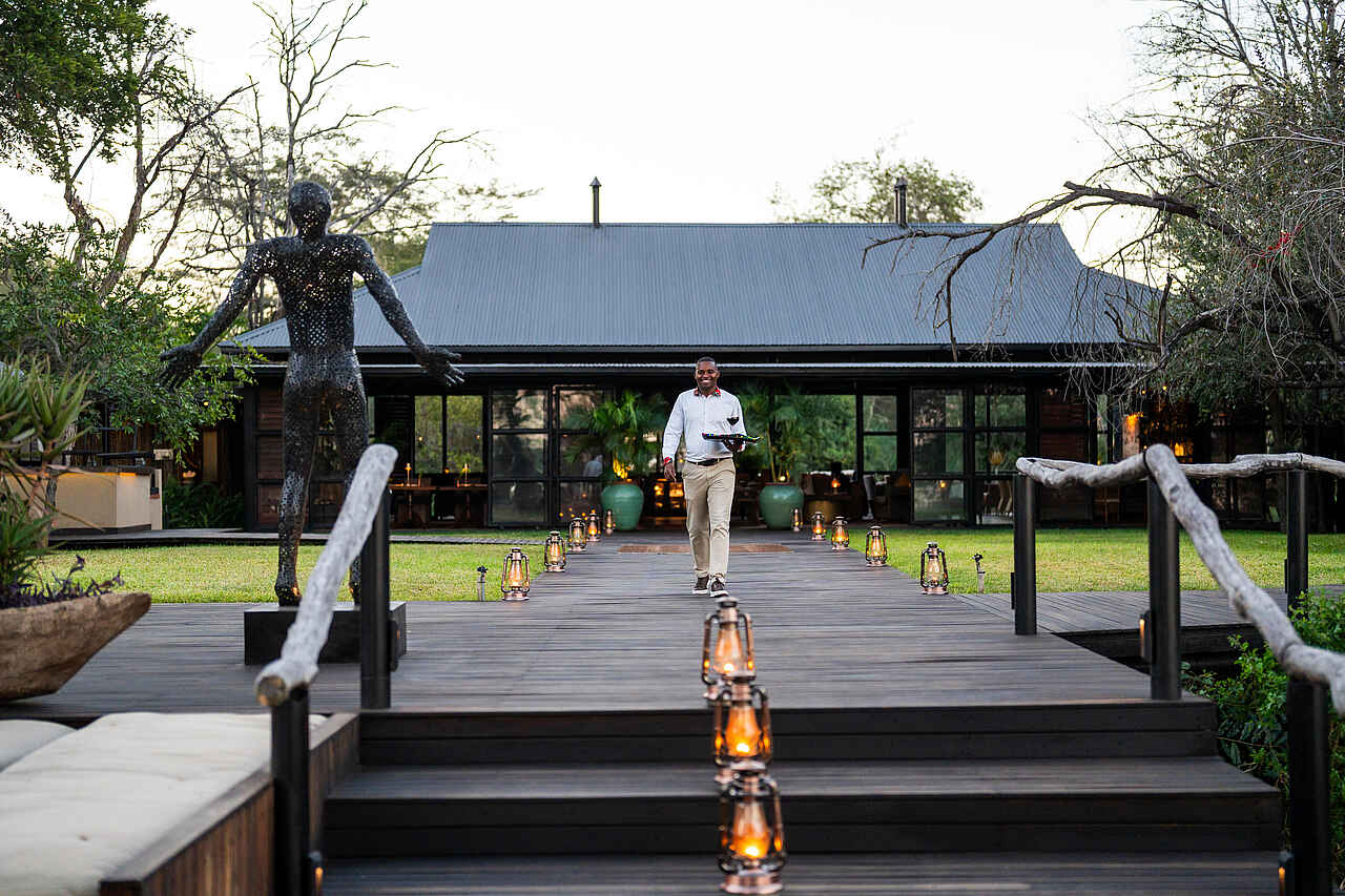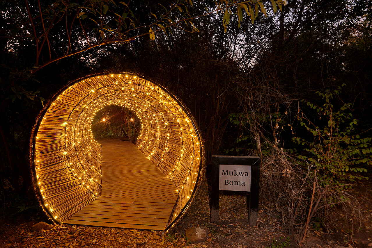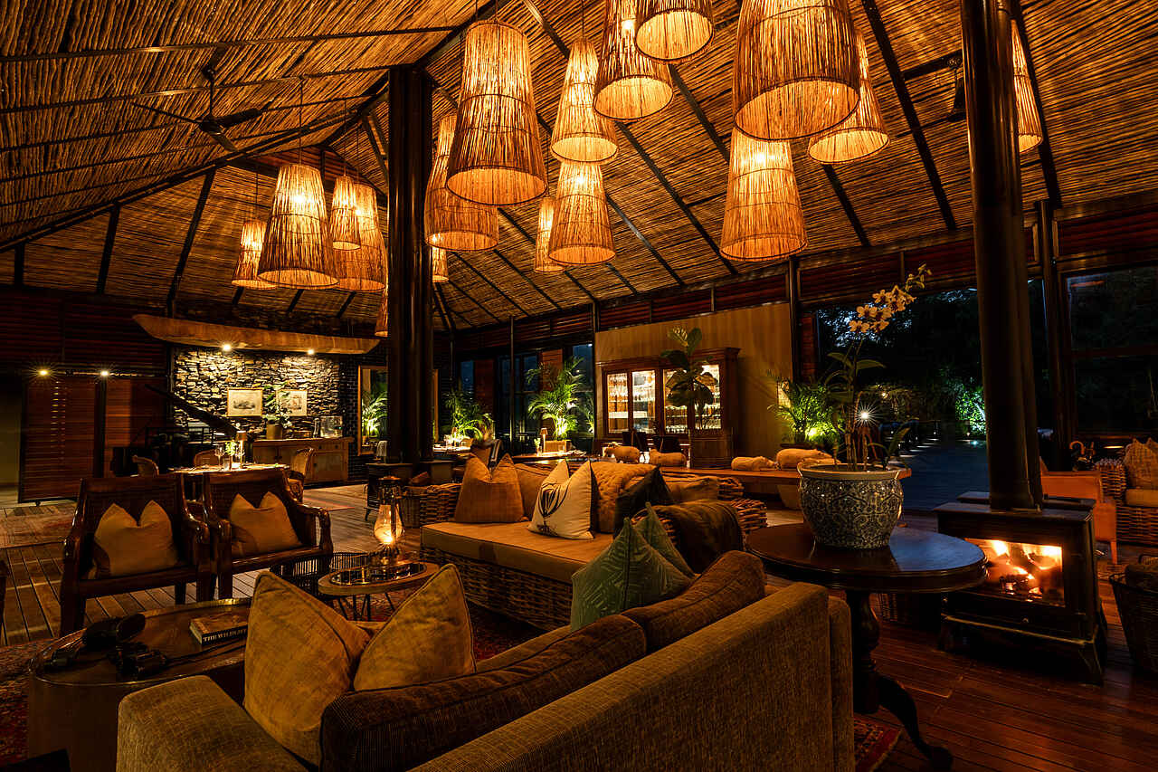 Das Herz der Mukwa River Lodge bildet ein offener Hauptbereich mit Lounge, Bar und Restaurant. Die Lounge bietet großzügige Sitzbereiche und einen Kamin, der an kühleren Abenden für Wärme sorgt. Ein weitläufiger Garten umgibt die Lodge und ein großer beheizter Pool mit Blick auf den Zambezi lädt zum entspannten Schwimmen ein. Gegessen wird im Restaurant, auf der Terrasse oder auf der hölzernen Uferplattform direkt am Fluss. Der Weinkeller erweitert das kulinarische Angebot und an der Boma klingt der Abend am Feuer aus. Ein Spa und Gym stehen für Erholung oder Bewegung bereit und eine Boutique sowie eine kleine Bibliothek runden das Angebot ab.