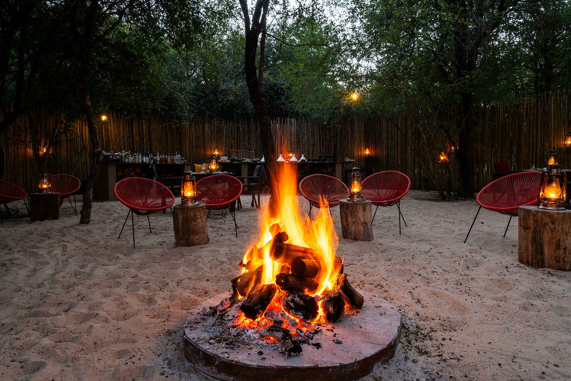 Das Herz der Mukwa River Lodge bildet ein offener Hauptbereich mit Lounge, Bar und Restaurant. Die Lounge bietet großzügige Sitzbereiche und einen Kamin, der an kühleren Abenden für Wärme sorgt. Ein weitläufiger Garten umgibt die Lodge und ein großer beheizter Pool mit Blick auf den Zambezi lädt zum entspannten Schwimmen ein. Gegessen wird im Restaurant, auf der Terrasse oder auf der hölzernen Uferplattform direkt am Fluss. Der Weinkeller erweitert das kulinarische Angebot und an der Boma klingt der Abend am Feuer aus. Ein Spa und Gym stehen für Erholung oder Bewegung bereit und eine Boutique sowie eine kleine Bibliothek runden das Angebot ab.