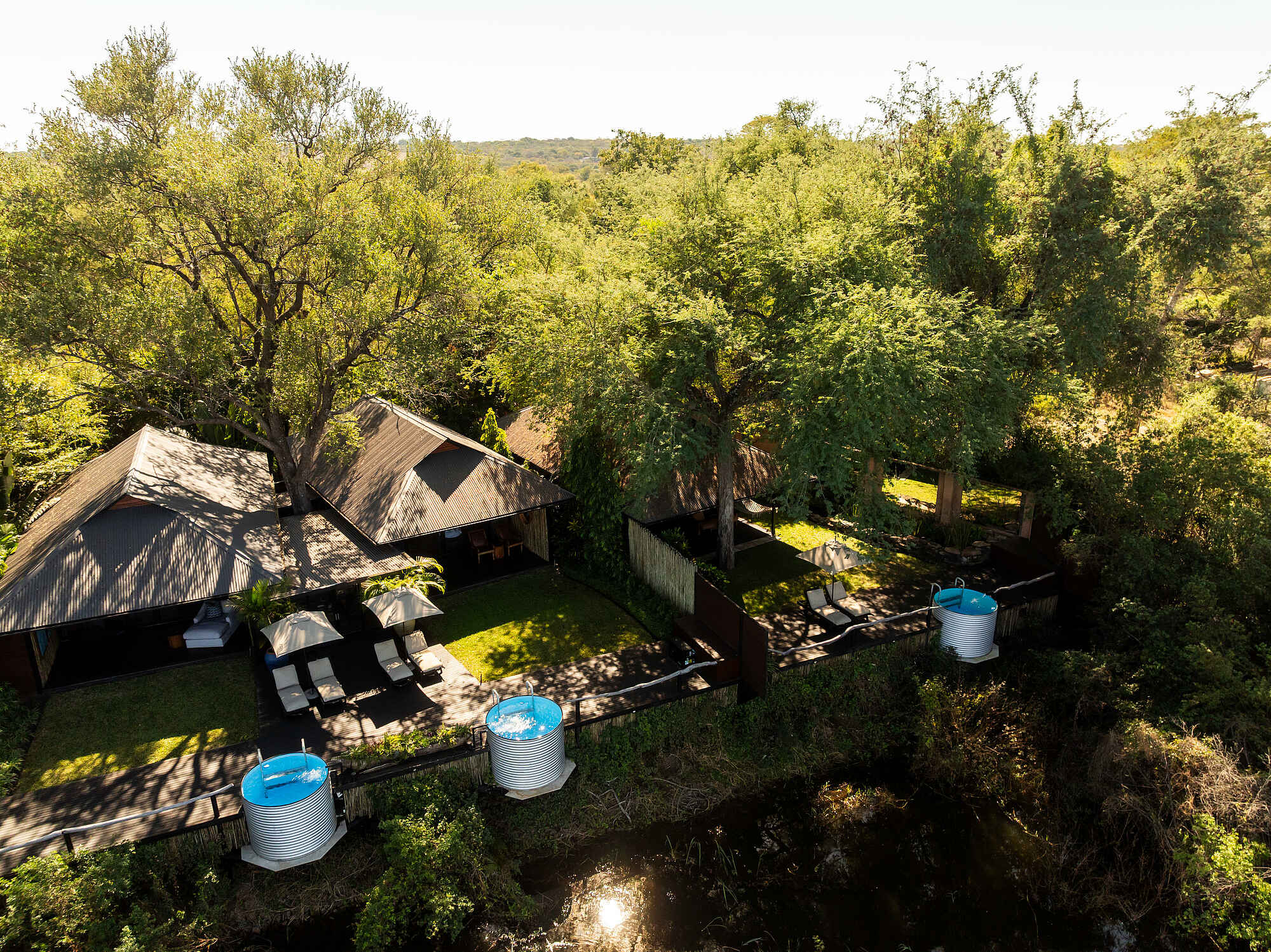 Die Suiten der Mukwa River Lodge liegen entweder direkt am Zambezi oder abgeschieden auf einer kleinen Flussinsel. Jede Unterkunft verfügt über ein großzügiges Schlafzimmer mit King-Size-Bett, feinen Stoffen und Moskitonetz. Die Ausstattung umfasst Klimaanlage, Minibar, Espressomaschine sowie eine Terrasse mit Sitzmöbeln und eigenem Plunge Pool. Das En-suite-Badezimmer ist offen gestaltet und bietet Doppelwaschbecken, eine große Innendusche, eine Doppelaußendusche sowie eine Badewanne mit Blick ins Grüne. Die Möbel wirken hochwertig, warm und im Stil afrikanischer Handwerkskunst. Das Familiencottage bietet zwei Schlafzimmer, jeweils mit eigenem En-suite-Badezimmer, sowie einen Wohn- und Essbereich, Küche, Garten und Swimmingpool.