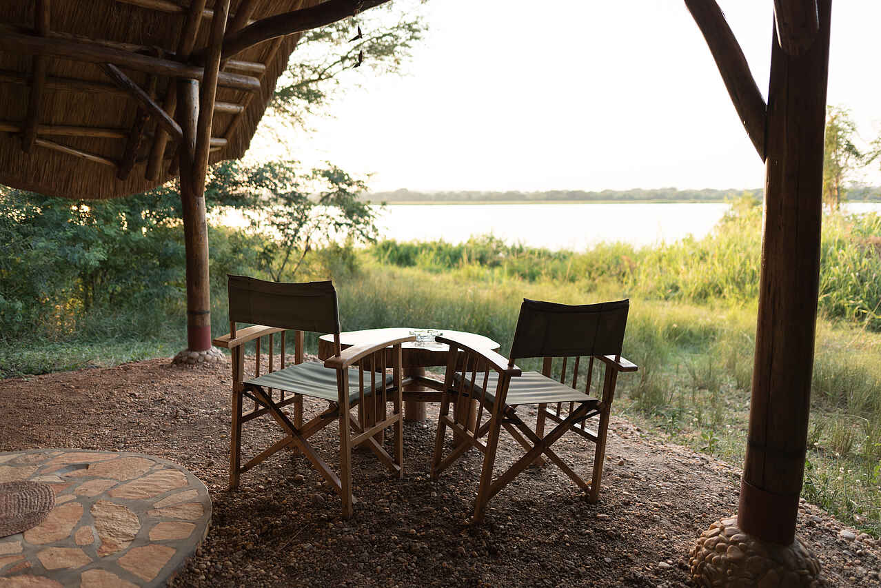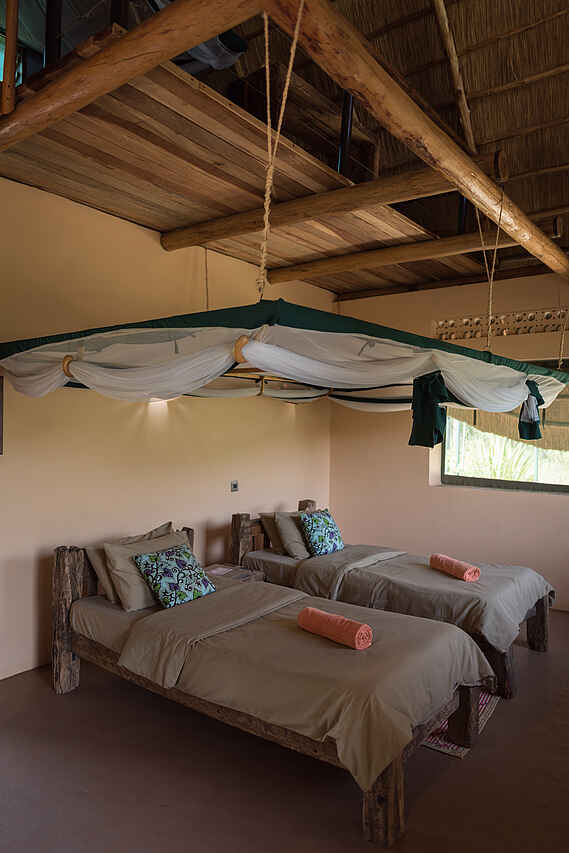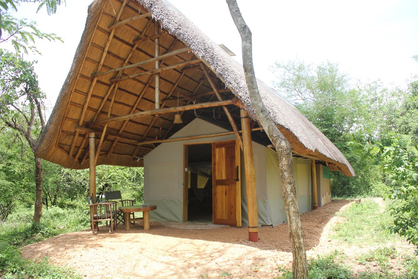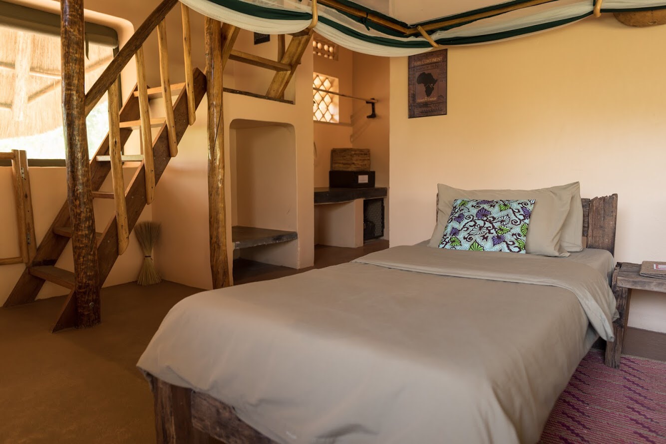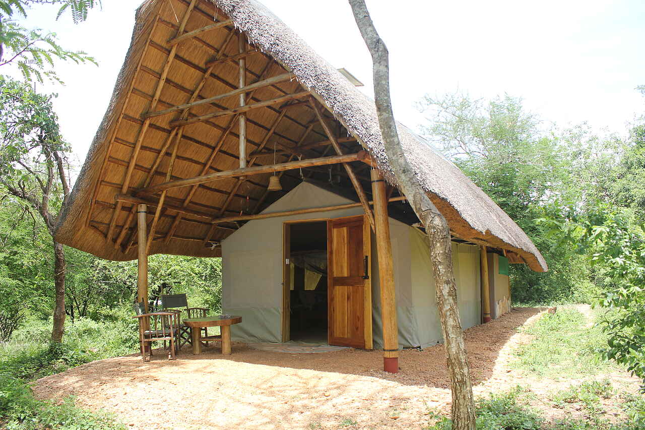 Im nördlichen Bereich des Geländes verteilen sich 4 geräumige, reetgedeckte und durchgehend offene en-suite Hütten. Sie verfügen über 2 Schlafräume: Ein Doppelbett im Obergeschoss und zwei Einzelbetten auf der Mezzanine. Zudem ist ein Badezimmer mit WC, Waschbecken und Dusche mit Kalt- und Warmwasser vorhanden. Die Innenausstattung umfasst individuell designte, rustikale Holzmöbeln, Solarleuchten, Bettwäsche, Handtücher, Moskitonetze. Den Hütten vorgelagert ist eine private Terrasse mit Blick auf die umliegende Buschlandschaft. Abends werden die Wege mit Laternen beleuchtet. Da die Anlage nicht umzäunt ist, werden die Gäste nach Einbruch der Dunkelheit aus Schutz vor Wildtieren vom Personal zu den Unterkünften geleitet. Alternativ dazu werden möblierte und strohgedeckte en-suite Safari-Zelte für 2 Personen in Ufernähe an.