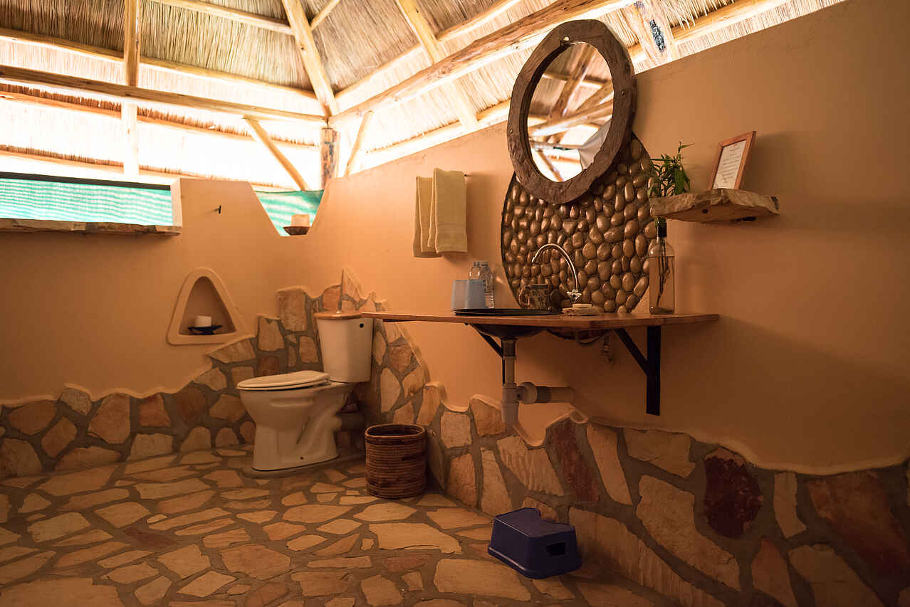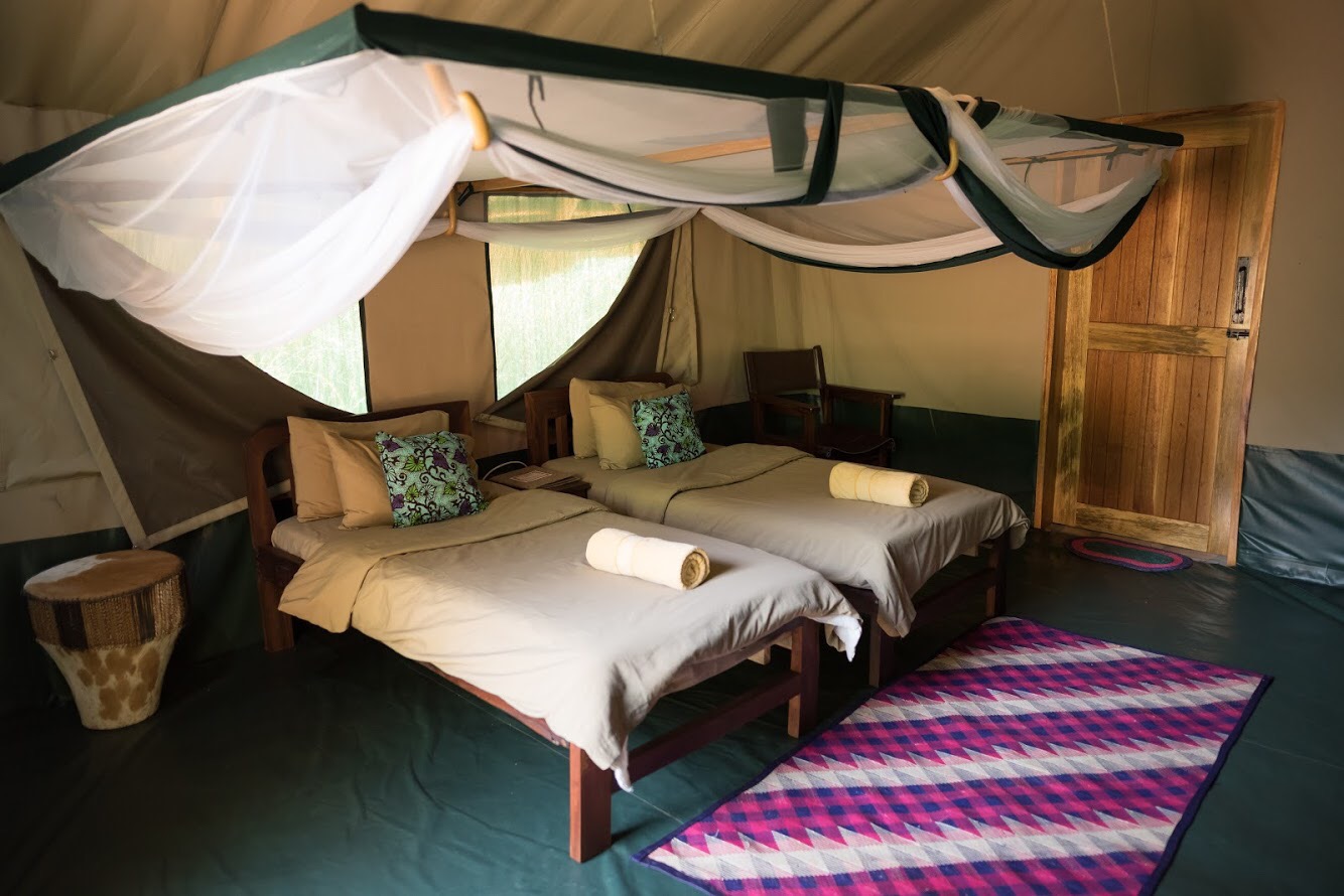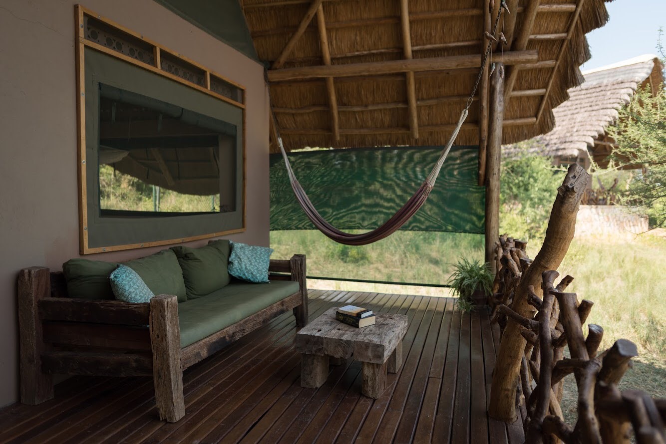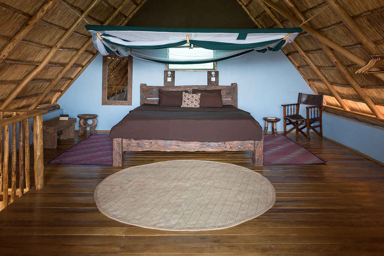 Im nördlichen Bereich des Geländes verteilen sich 4 geräumige, reetgedeckte und durchgehend offene en-suite Hütten. Sie verfügen über 2 Schlafräume: Ein Doppelbett im Obergeschoss und zwei Einzelbetten auf der Mezzanine. Zudem ist ein Badezimmer mit WC, Waschbecken und Dusche mit Kalt- und Warmwasser vorhanden. Die Innenausstattung umfasst individuell designte, rustikale Holzmöbeln, Solarleuchten, Bettwäsche, Handtücher, Moskitonetze. Den Hütten vorgelagert ist eine private Terrasse mit Blick auf die umliegende Buschlandschaft. Abends werden die Wege mit Laternen beleuchtet. Da die Anlage nicht umzäunt ist, werden die Gäste nach Einbruch der Dunkelheit aus Schutz vor Wildtieren vom Personal zu den Unterkünften geleitet. Alternativ dazu werden möblierte und strohgedeckte en-suite Safari-Zelte für 2 Personen in Ufernähe an.