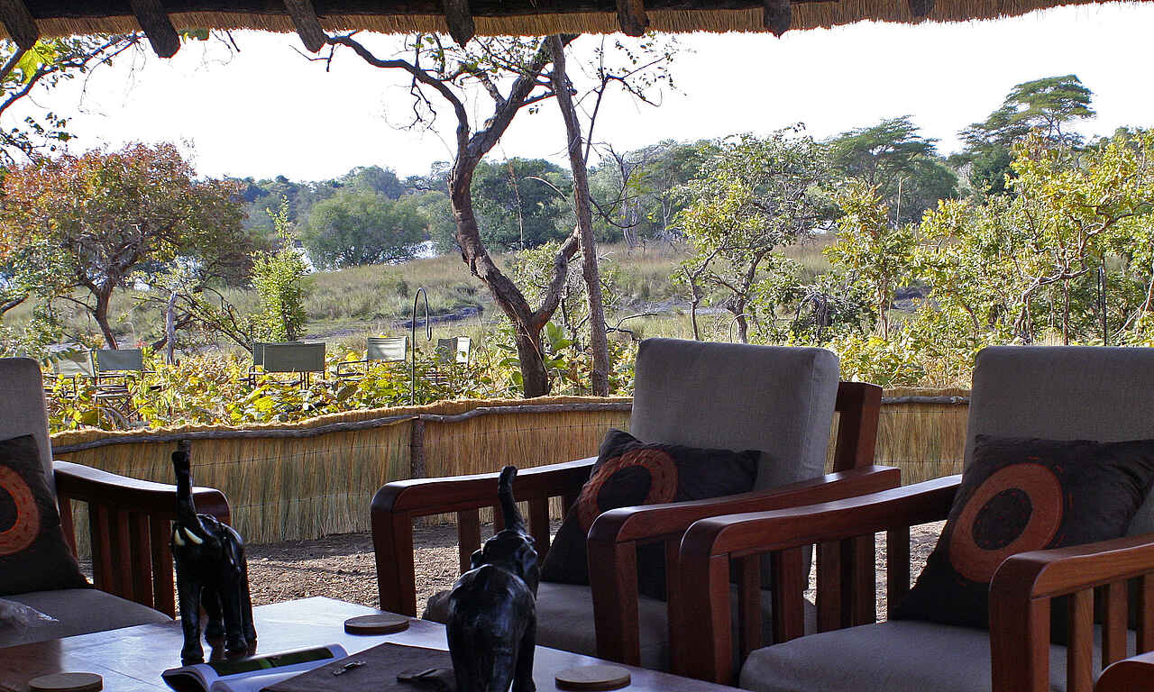 Das Hauptgebäude ist eine reetgedeckte, kleine Lodge mit Blick auf eine Flutebene. Seitlich geöffnet. Sitzgruppen, kleine Bibliothek, Esstisch.
