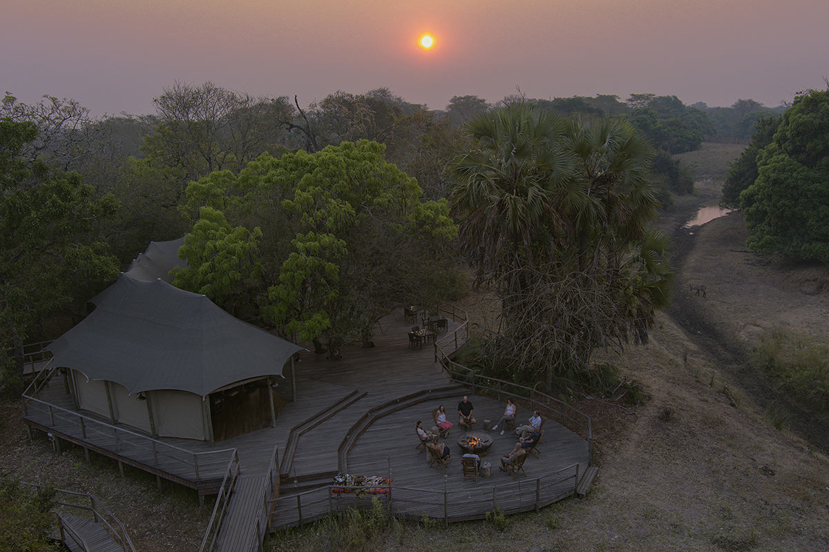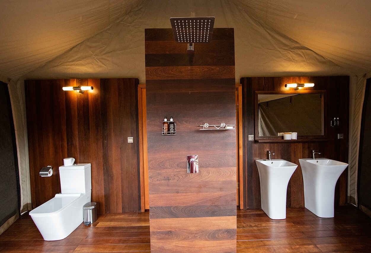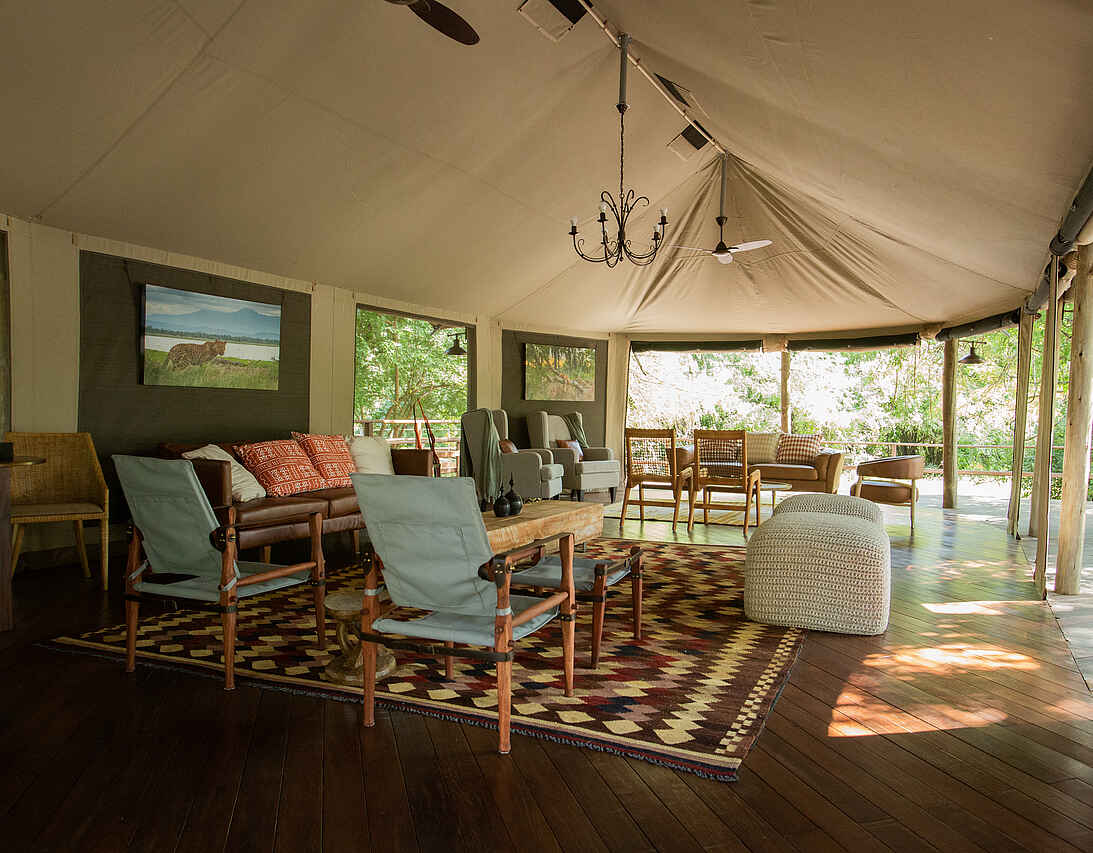 Die sechs großzügigen Zeltsuiten wurden auf erhöhten Holzplattformen errichtet und bieten eine beeindruckende Aussicht auf die Natur. Jedes Zelt ist mit hochwertigen Kingsize-Betten oder Einzelbetten ausgestattet, die von Moskitonetzen umgeben sind. Zur weiteren Ausstattung gehören ein Deckenventilator, eine Tee- und Kaffeestation, ein Safe sowie Steckdosen für internationale Adapter. Die En-suite-Badezimmer verfügen über Doppelwaschbecken, großzügige Duschen und hochwertige, umweltfreundliche Pflegeprodukte. Private Terrassen mit gemütlichen Sitzmöglichkeiten laden dazu ein, die Geräusche der Wildnis in völliger Ruhe zu genießen.