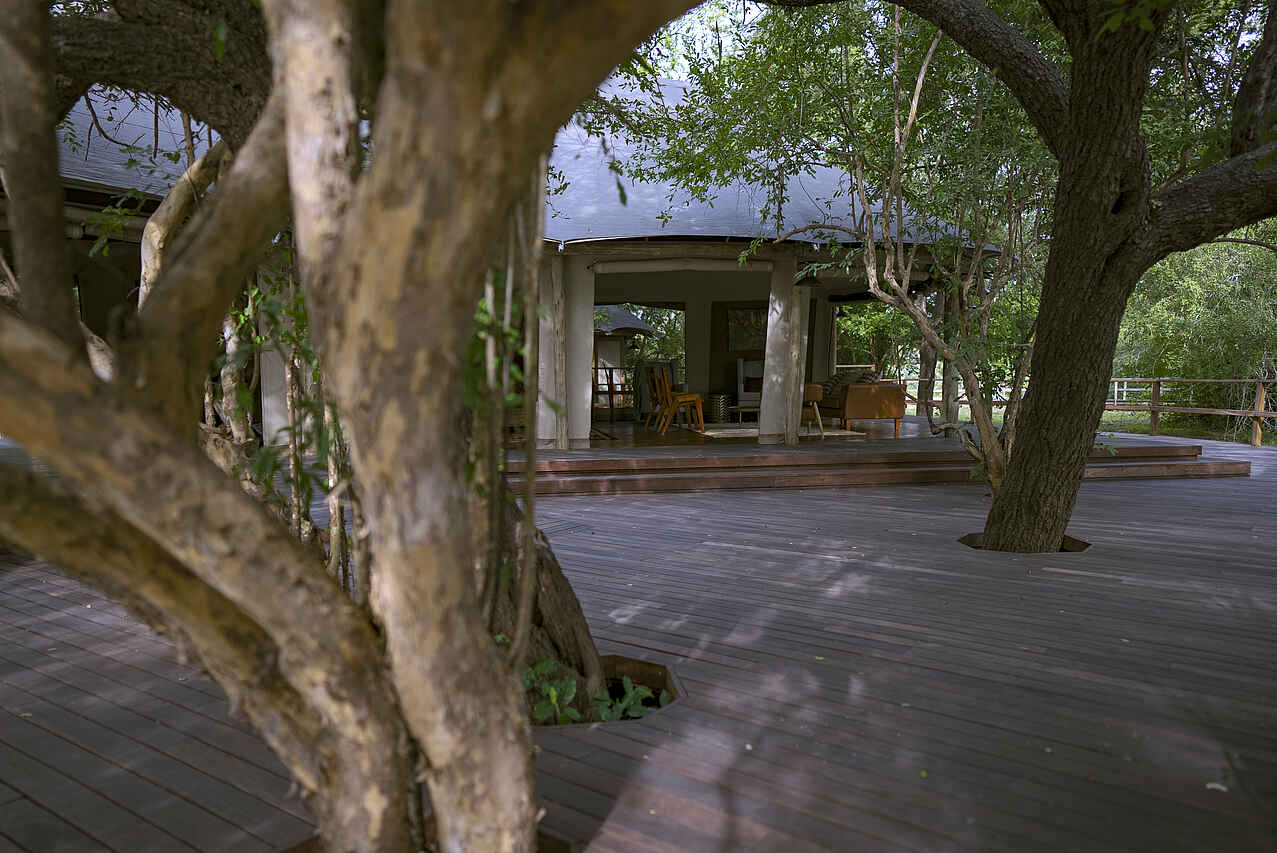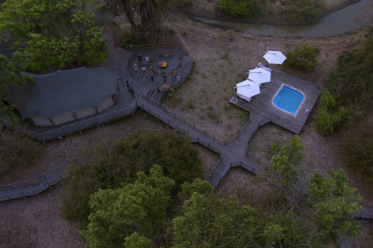 Das Herzstück der Lodge bildet ein offener Speisebereich mit Panoramadeck, das einen ungestörten Blick auf den Fluss und die umliegende Wildnis ermöglicht. Eine stilvolle Lounge mit komfortablen Sitzgelegenheiten lädt zum Entspannen ein, während eine Bar exklusive Getränke und Cocktails anbietet. Ein Swimmingpool sorgt für eine erfrischende Abkühlung und bietet gleichzeitig einen idealen Aussichtspunkt für Tierbeobachtungen am Fluss. Am Abend versammelt man sich um die Feuerstelle, um den Tag bei Geschichten und dem Klang der afrikanischen Wildnis ausklingen zu lassen. Gäste profitieren zudem von kostenlosem WLAN in den zentralen Bereichen und einem Wäscheservice für zusätzlichen Komfort.