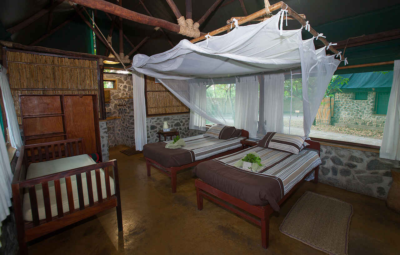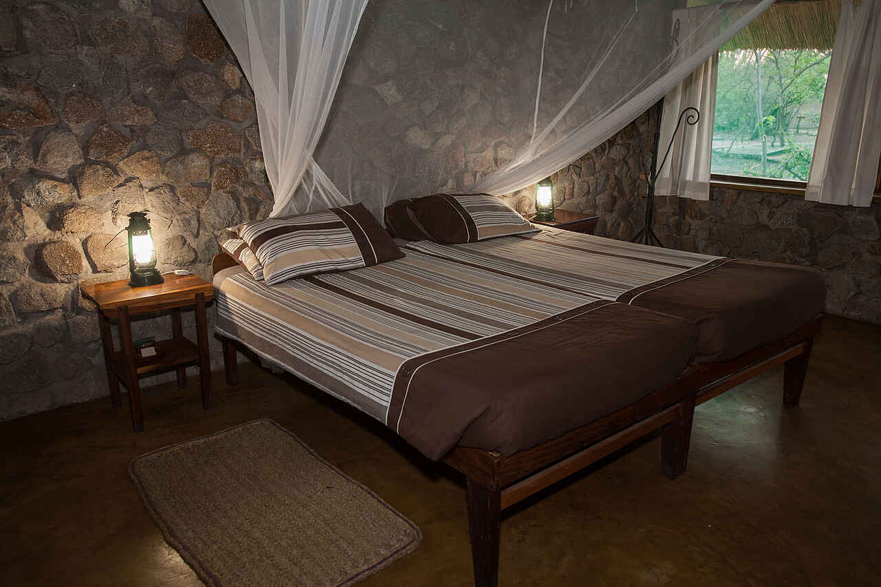 12 Stein- und Canvas-Chalets mit Doppelbett, Moskitonetzen, Panoramafenstern Nachtkästchen, Stauraum, Sitzgelegenheiten. Familienzelte bieten einen zusätzlichen Raum. Wäscheservice inkl. Zudem steht ein großes Camping-Areal zur Verfügung.