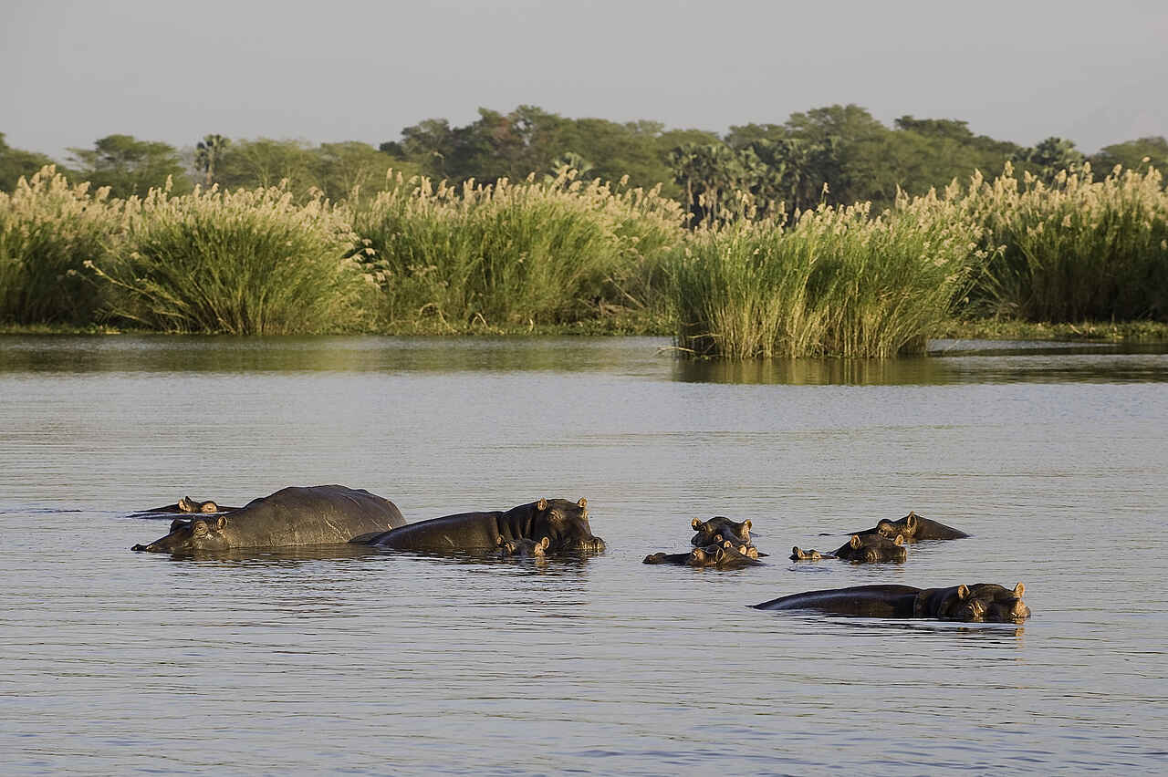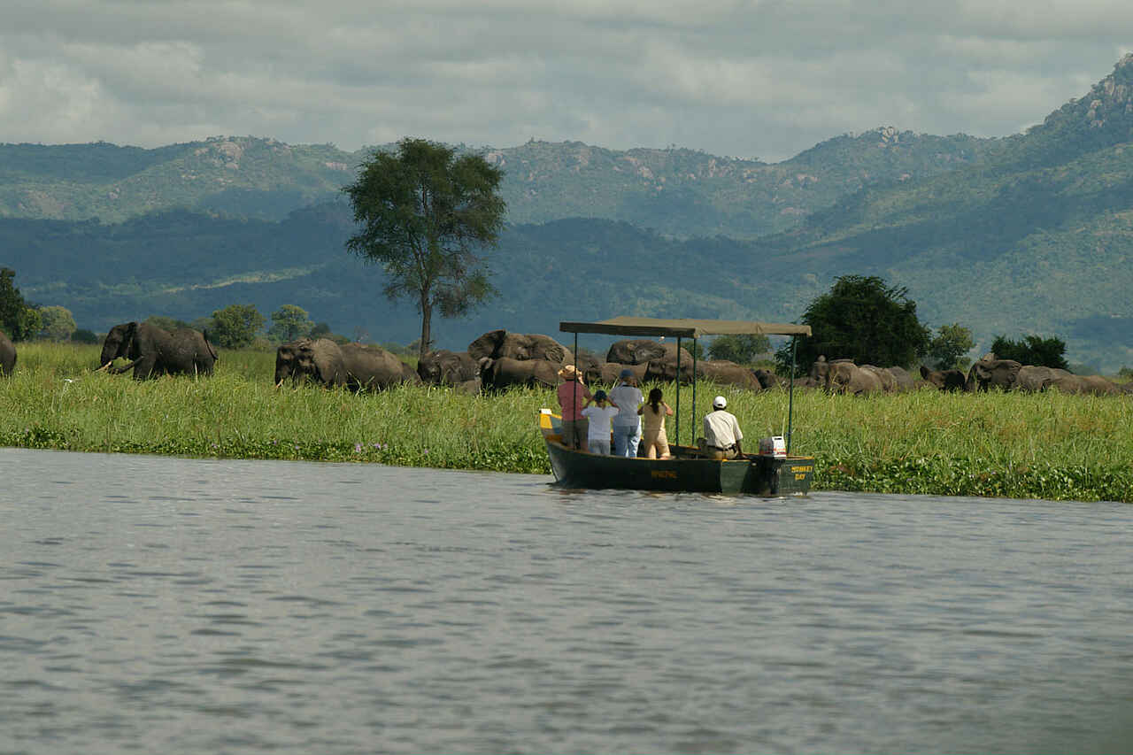 Die größte Nilpferd- und Elefantenpopulation des Landes, Spitzmaulnashörner, Liwonde Nationalpark, Motorbootsafari.