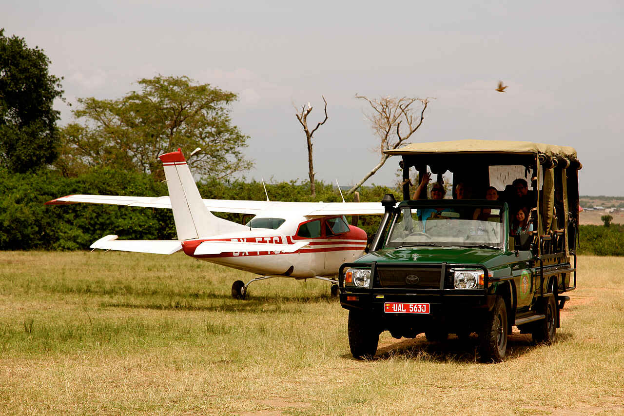Vom Entebbe International Airport einstündiger Flug zur Landebahn auf Mweya, Hotel nur wenige Gehminuten entfernt, mit dem Auto ca. 420km von Kampala entfernt