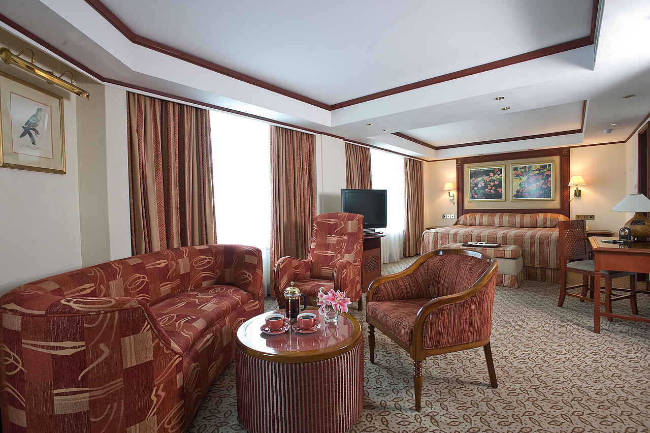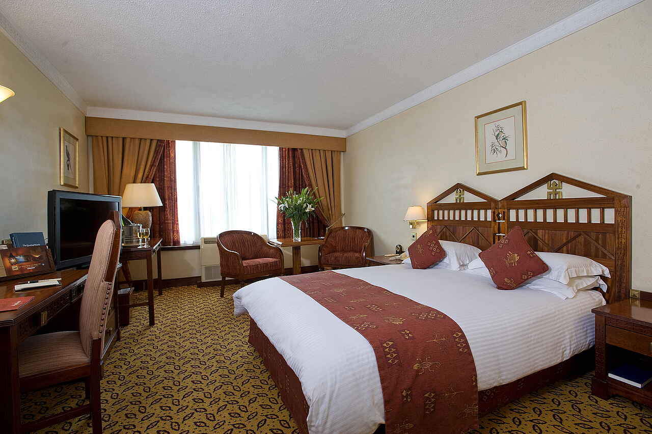In dem Hauptgebäude befinden sich insgesamt 183 Zimmer in verschiedenen Kategorien: 162 Doppelzimmer, 5 Superior Rooms, 16 Suiten. Standardzimmer geräumig mit Teppichboden Schreibtisch, mit Anrichte, Fernseher, zwei gepolsterte Lehnstühle mit Tischen, King Size Bett (oder Twin), großes Fenster mit Vorhängen. Ansonsten hell und schlicht gehalten. Farblich wurden beruhigende Rot-, Braun- und Gelbtöne verwendet. Das Mobiliar ist durchweg hochwertig, solide und aus Holz. Due Superior Rooms und Suiten deutlich prachtvoller, mit interessanter Innenarchitektur die an eines der Stilthemen des Hotels angelehnt ist - orientalisch, asiatisch, afrikanisch. Alle Zimmer En-Suite mit WiFi, Telefon, Fernseher, Minibar, Klimaanlage.