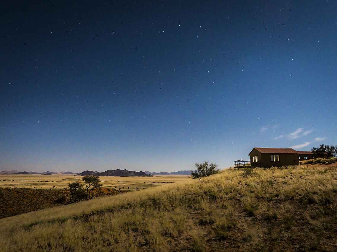 Das Namib Dune Star Camp hat einen ungewöhnlichen Standort, da es abseits vom Sossusvlei trotzdem und wirklich mitten in den Dünen am Rande des Nationalparks liegt. Die Cabins des Namib Dune Star Camps besitzen alle eine große, private Terrasse, auf die das Doppelbett leicht aus dem Inneren hinausgeschoben werden kann, um eine Nacht unter der Sternen zu verbringen. Die Hanglage des Camps lässt einen weiten Blick über die Wüstenlandschaft zu.
