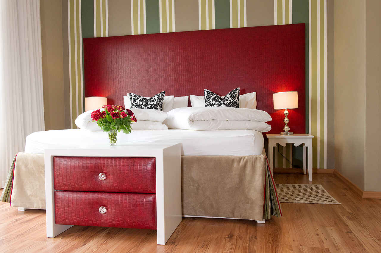 Die 8 Zimmer und Suiten des Namib Guesthouse überzeugen durch modernes Design und klare Linien. Die Ausstattung umfasst komfortable Betten mit edler Bettwäsche, einen Fernseher, kostenfreies WLAN, einen Safe, eine Minibar sowie Tee- und Kaffeezubereitungsmöglichkeiten. Jedes stilvoll gestaltete Zimmer verfügt über ein eigenes Bad mit hochwertigen Armaturen, Waschbecken, WC und Dusche, ergänzt durch einen Haartrockner und weiche Handtücher. Die Luxuszimmer bieten mehr Raum und sind zusätzlich mit einer Badewanne ausgestattet. Die Familiensuite mit zwei Schlafzimmern bietet Platz für bis zu fünf Personen. Helle Farben, ein durchdachtes Raumkonzept und liebevoll gesetzte Details schaffen ein einladendes Ambiente, das zum Entspannen einlädt.
