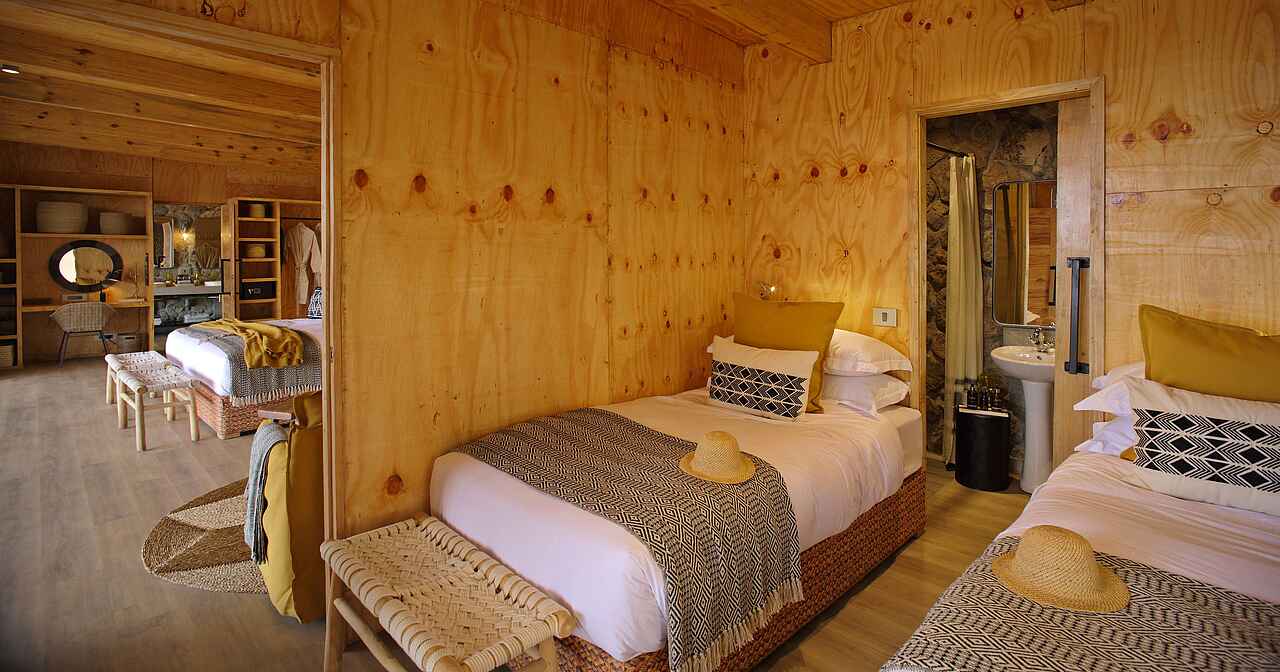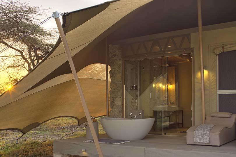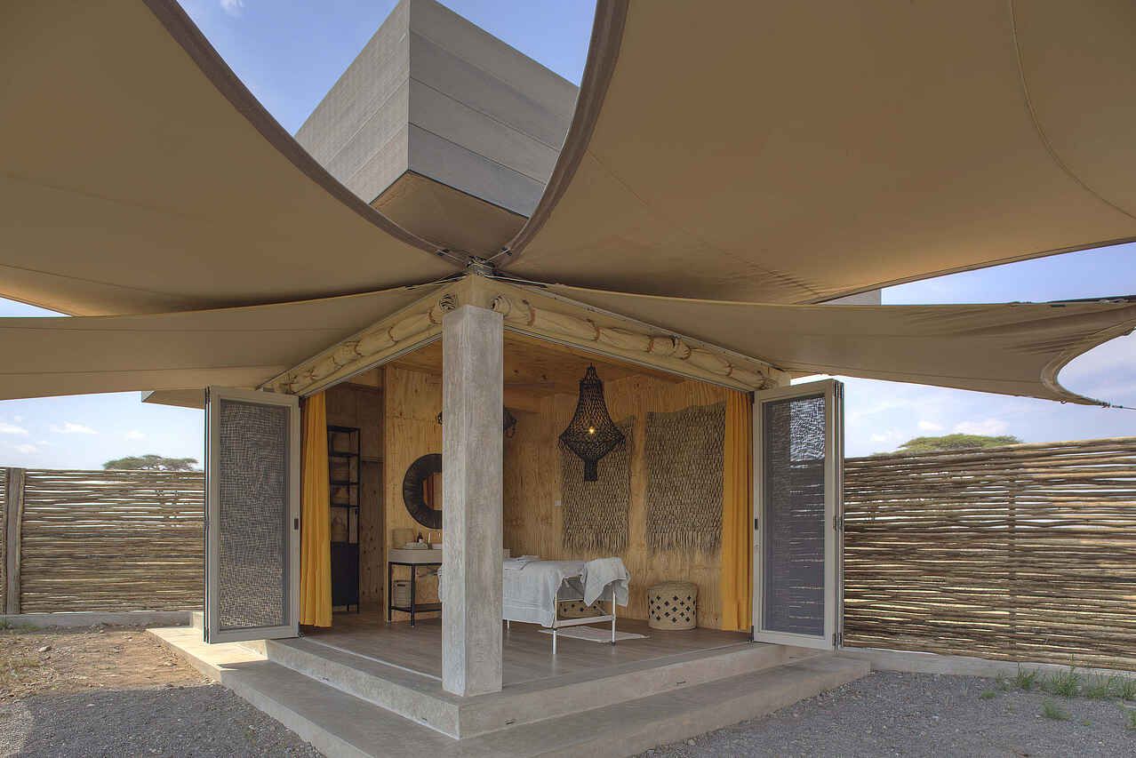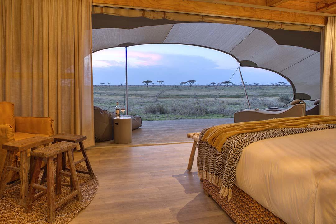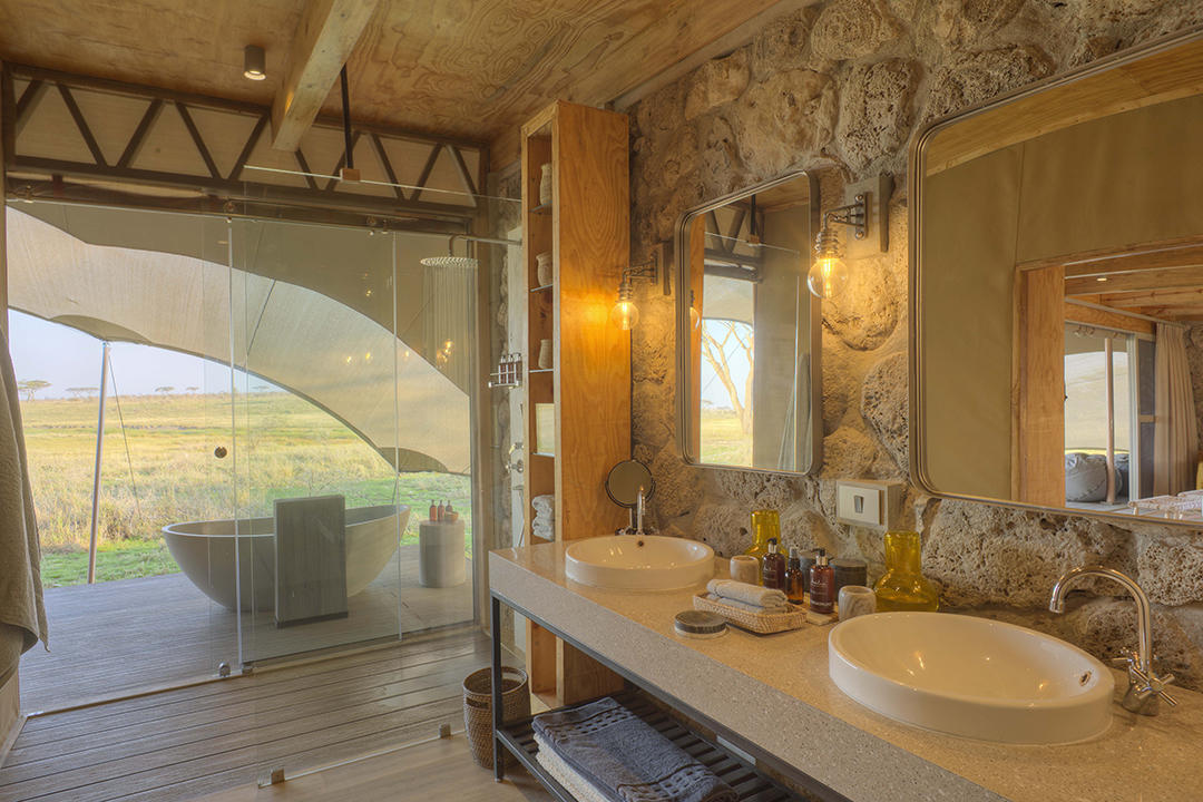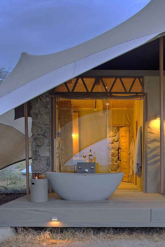 Das Namiri Plains Camp verfügt über 11 luxuriöse Zeltsuiten, großzügig geschnitten und in klaren Linien mit warmen Naturtönen gestaltet. Jede Suite hat ein großes Doppelbett oder zwei Einzelbetten mit Moskitonetz, eine Sitzecke, Ablageflächen und eine private Veranda mit weiter Sicht in die Ebenen. Das En-suite-Badezimmer umfasst eine Innendusche, Doppelwaschbecken, Spültoilette, Handtücher, Pflegeprodukte und einen Haartrockner; eine Badewanne im Freien sorgt für besondere Momente unter dem Himmel der Serengeti. Minibar, Trinkwasser sowie Kaffee- und Teezubereitungsmöglichkeiten stehen bereit. Die Familienzelte verfügen über zwei Schlafzimmer und einen gemeinsamen Wohnbereich. Die Zelte sind lichtdurchflutet und so ausgerichtet, dass Gäste die offene Savanne jederzeit im Blick behalten.