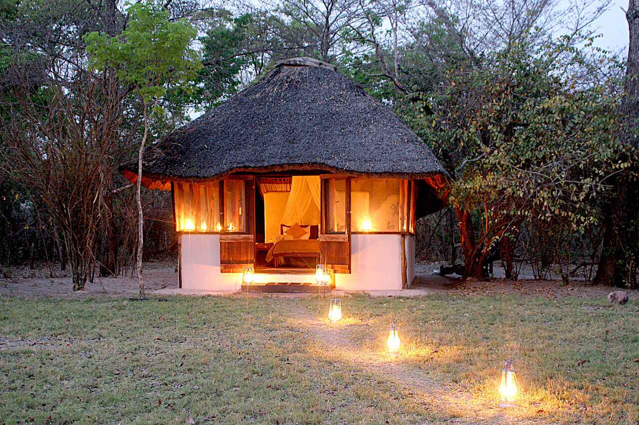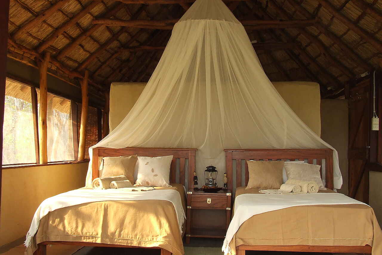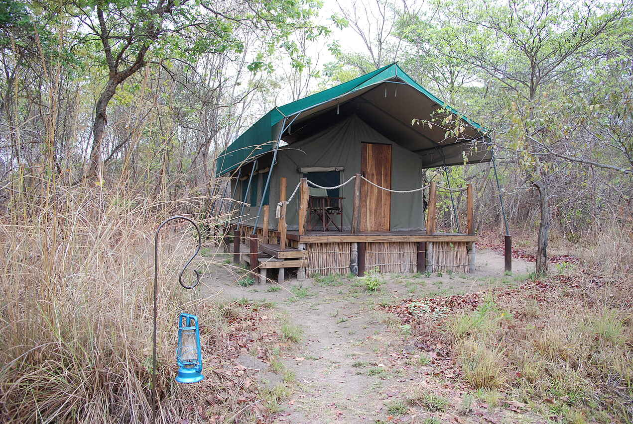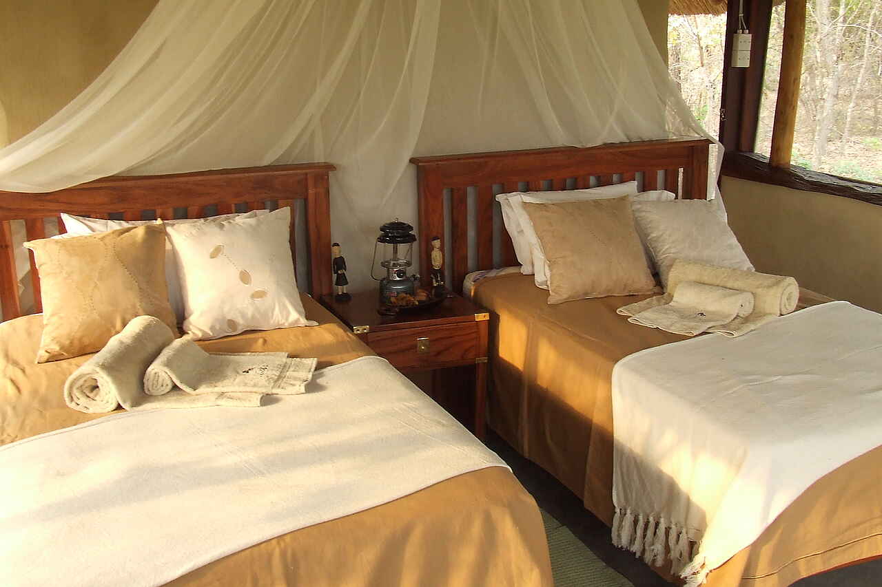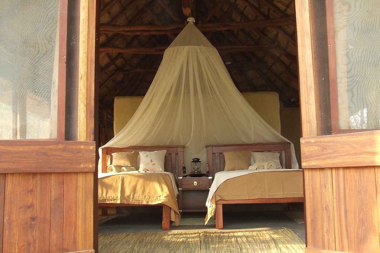 Es gibt drei Gästechalets, die einigermaßen fest gebaut sind, und drei typische Safarizelte, für je 2 Personen mit privaten Bädern mit 2 Waschbecken, Dusche WC sowie fließend Kalt- und Warmwasser. Überwiegend Doppelbetten, alle mit Moskitonetzen. Die Unterkünfte stehen am Waldrand und haben den Blick auf die Dambo vor dem Camp.
