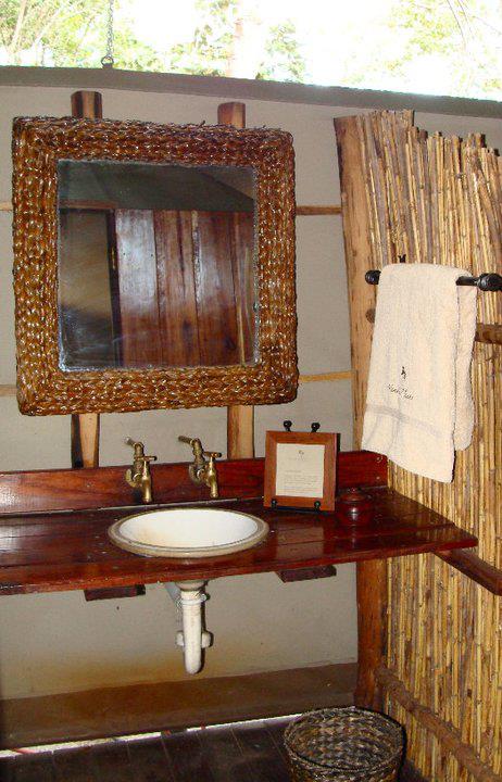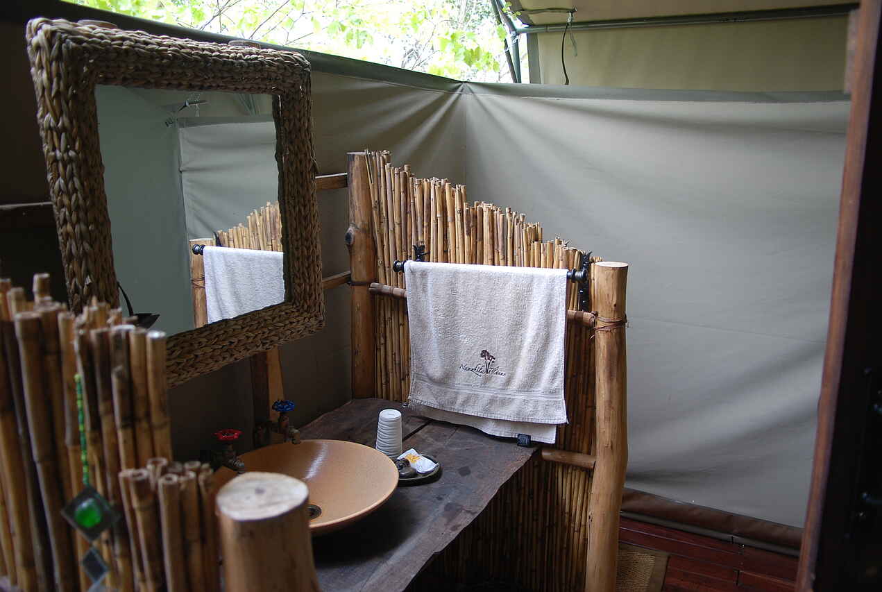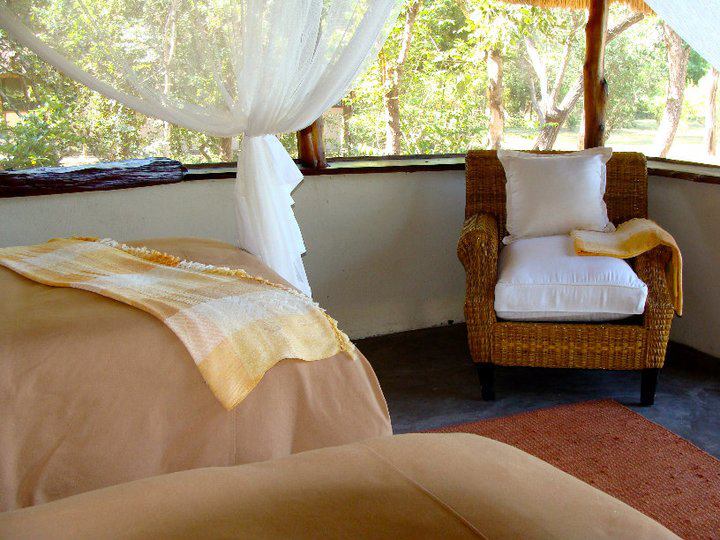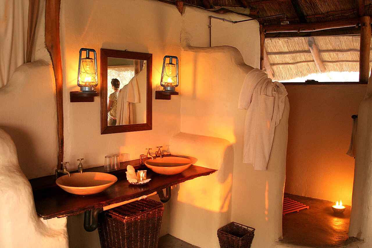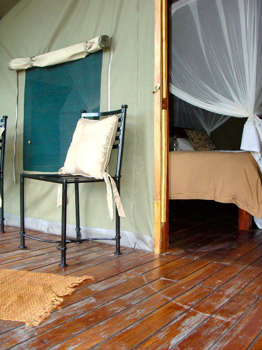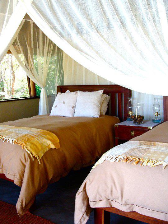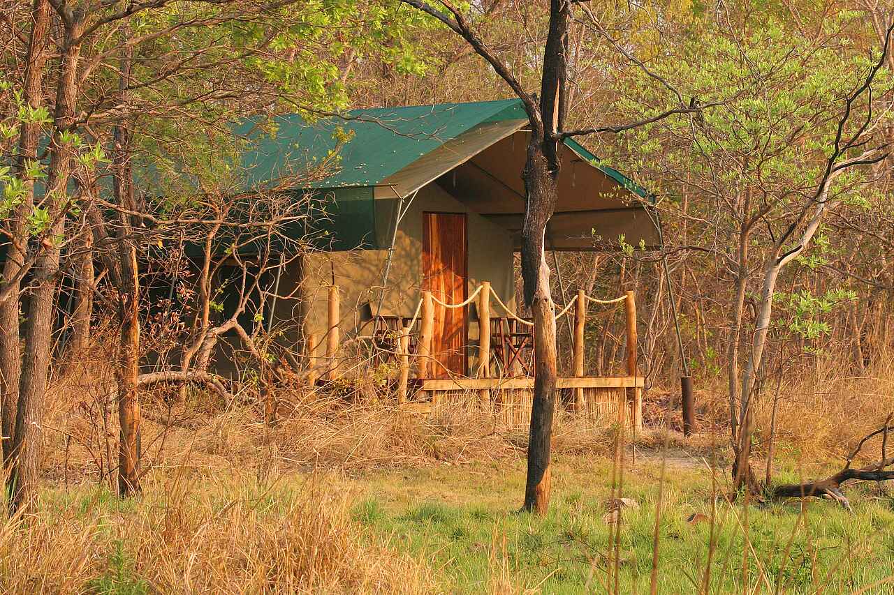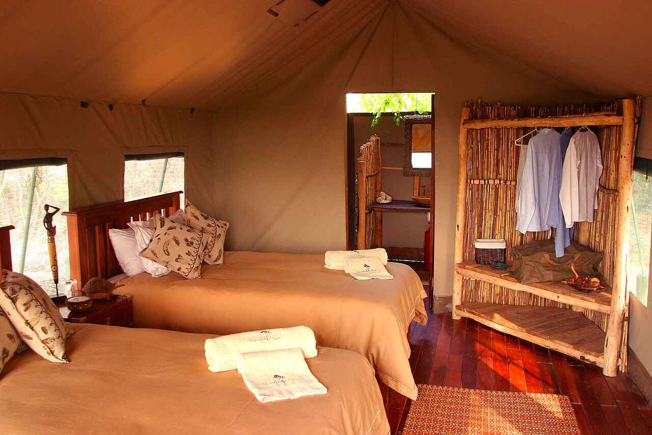 Es gibt drei Gästechalets, die einigermaßen fest gebaut sind, und drei typische Safarizelte, für je 2 Personen mit privaten Bädern mit 2 Waschbecken, Dusche WC sowie fließend Kalt- und Warmwasser. Überwiegend Doppelbetten, alle mit Moskitonetzen. Die Unterkünfte stehen am Waldrand und haben den Blick auf die Dambo vor dem Camp.
