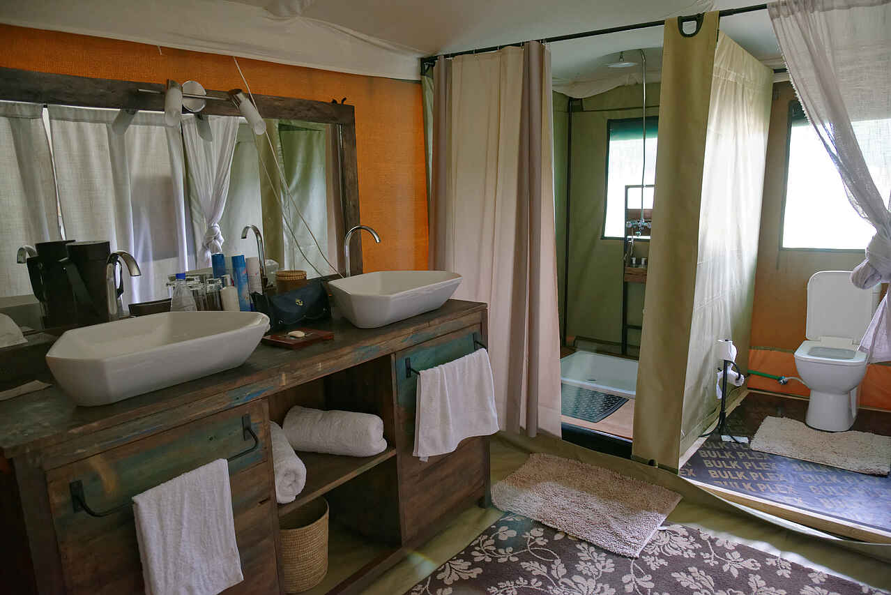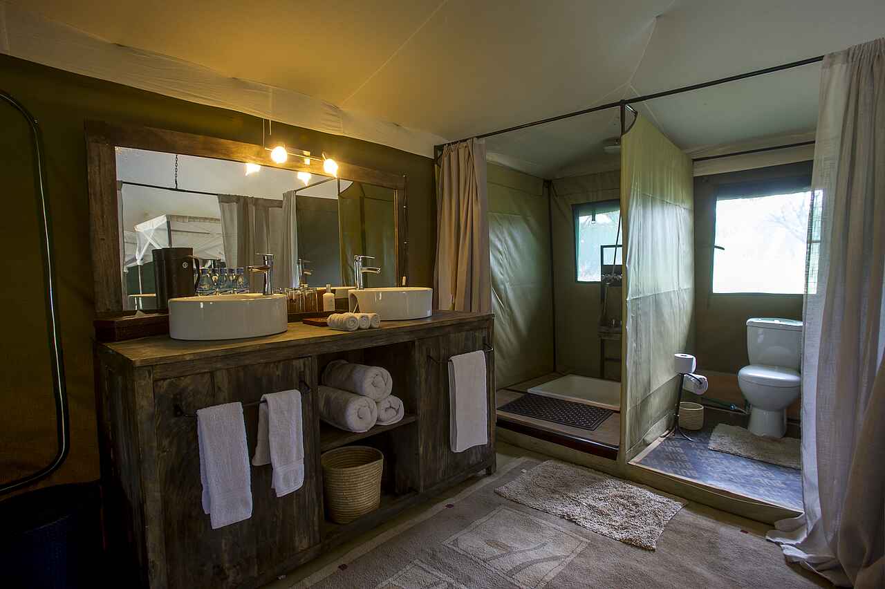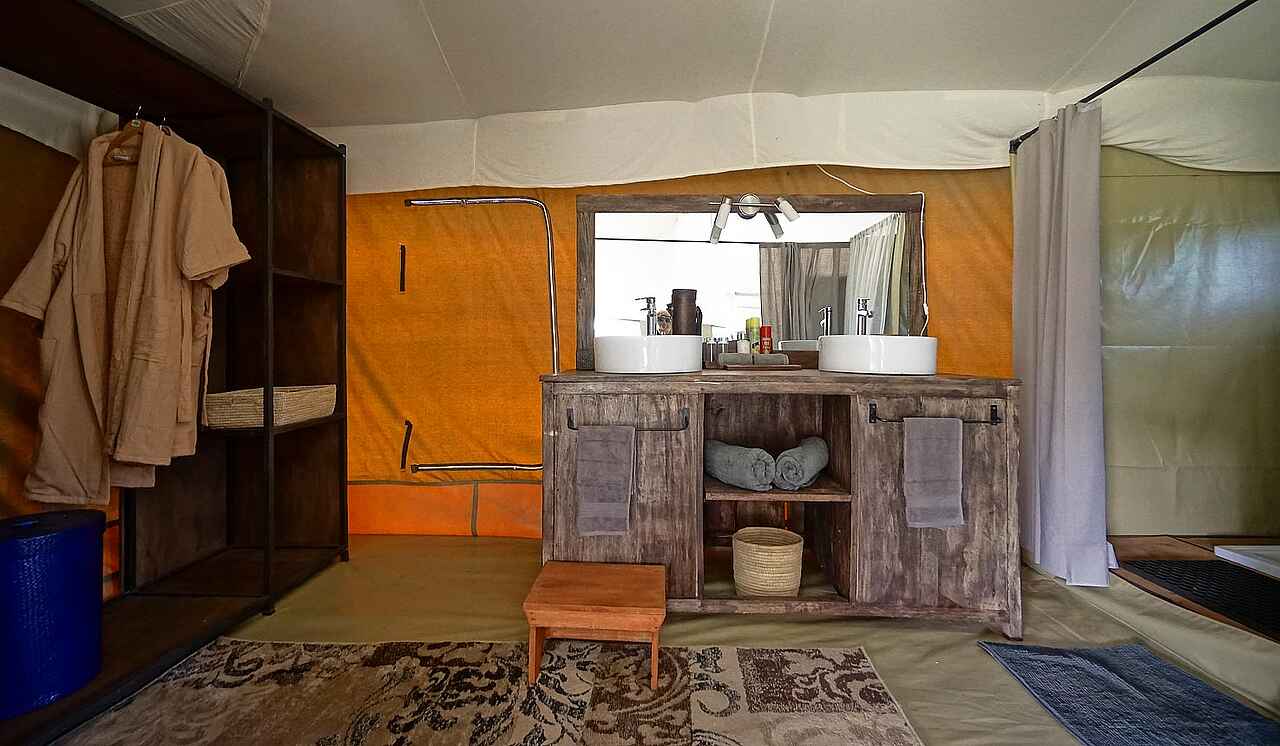 8 Gästezelte. Doppel- Twin oder Dreibettzimmer in Familienbelegung möglich. Separates Bad mit zwei Waschbecken, Dusche, Spültoilette. Ausstattung: Schreibtisch, Minilounge, kleine Veranda.