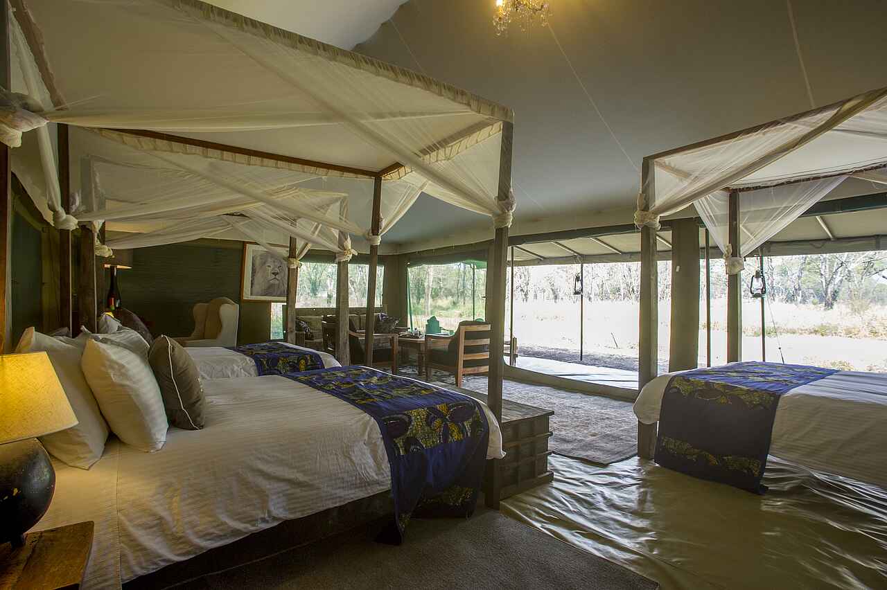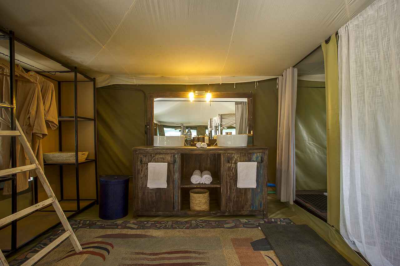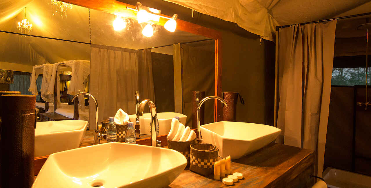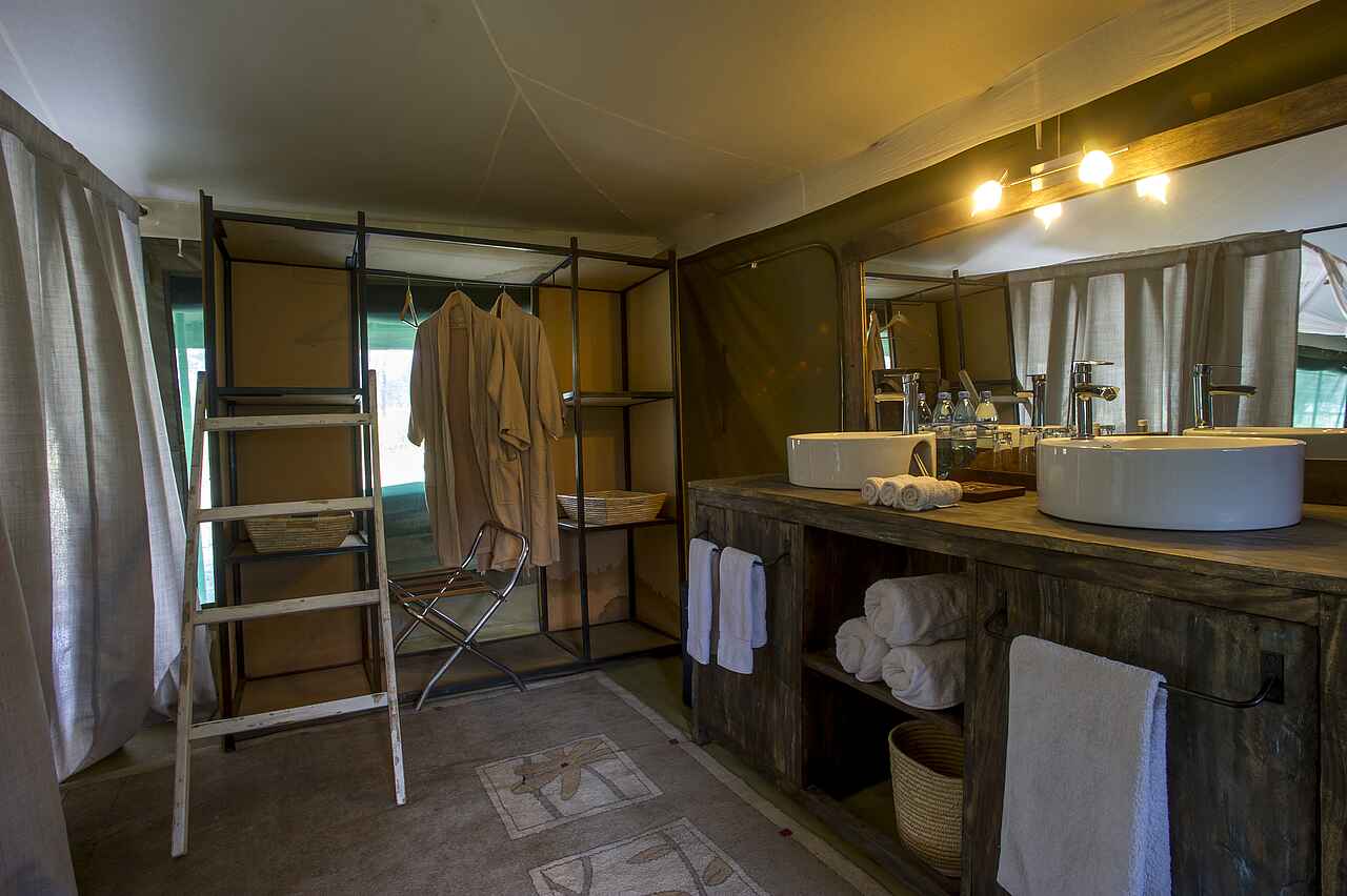 8 Gästezelte. Doppel- Twin oder Dreibettzimmer in Familienbelegung möglich. Separates Bad mit zwei Waschbecken, Dusche, Spültoilette. Ausstattung: Schreibtisch, Minilounge, kleine Veranda.