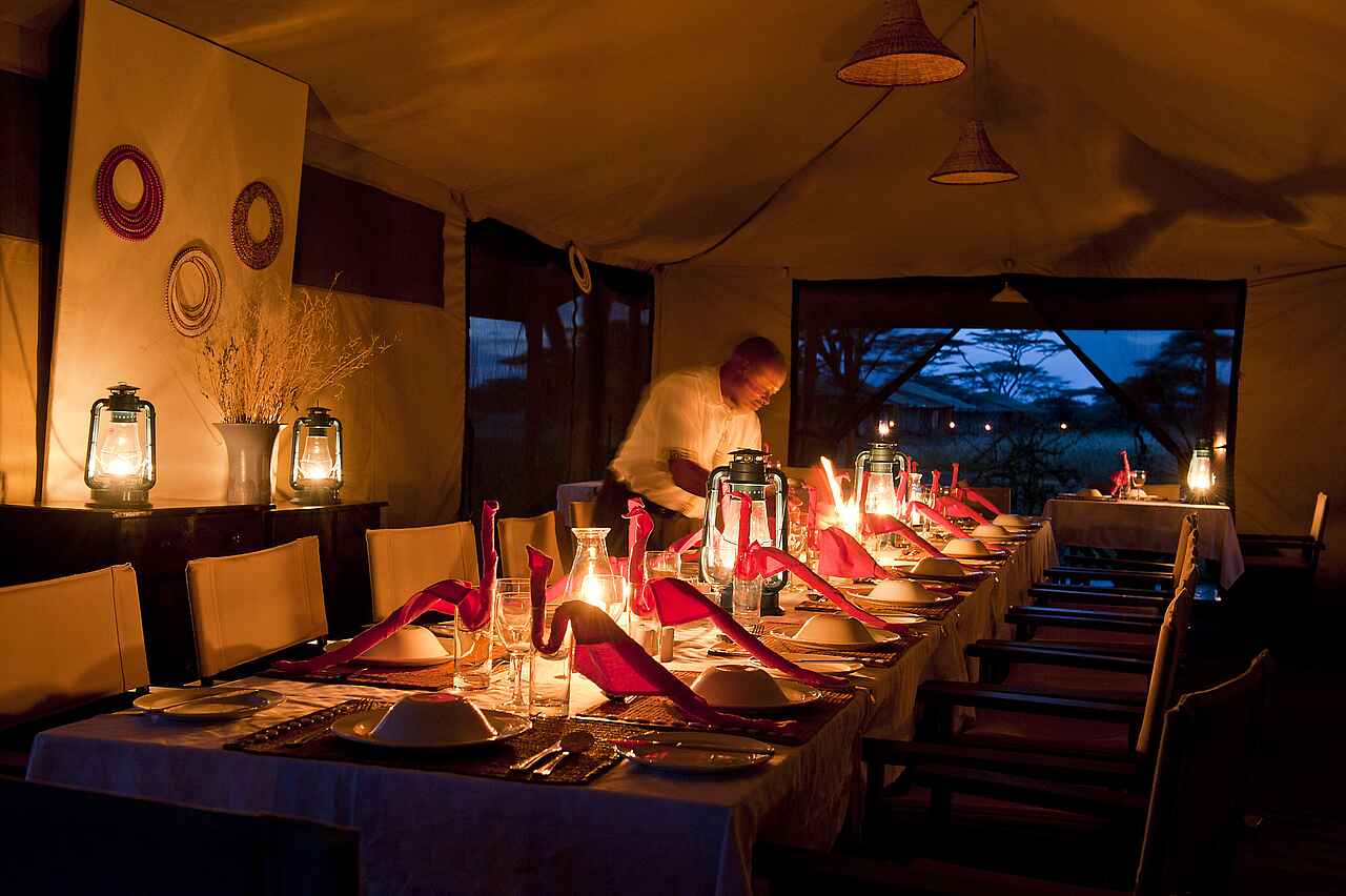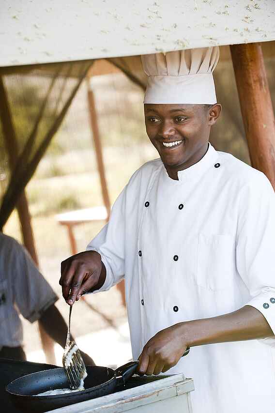 Vollpension inklusive. Gemeinschaftliche Speisen im Essbereich des Hauptzeltes. Frühstück und Mittagessen in Buffetform, Abends wird das Essen serviert. Für unterwegs werden Lunchboxen zubereitet. Die Küche bietet eine Mischung aus typisch tansanischen und internationalen Gerichten. Spezielle Ernährungsbedürfnisse werden bei Vorankündigung gerne berücksichtigt.