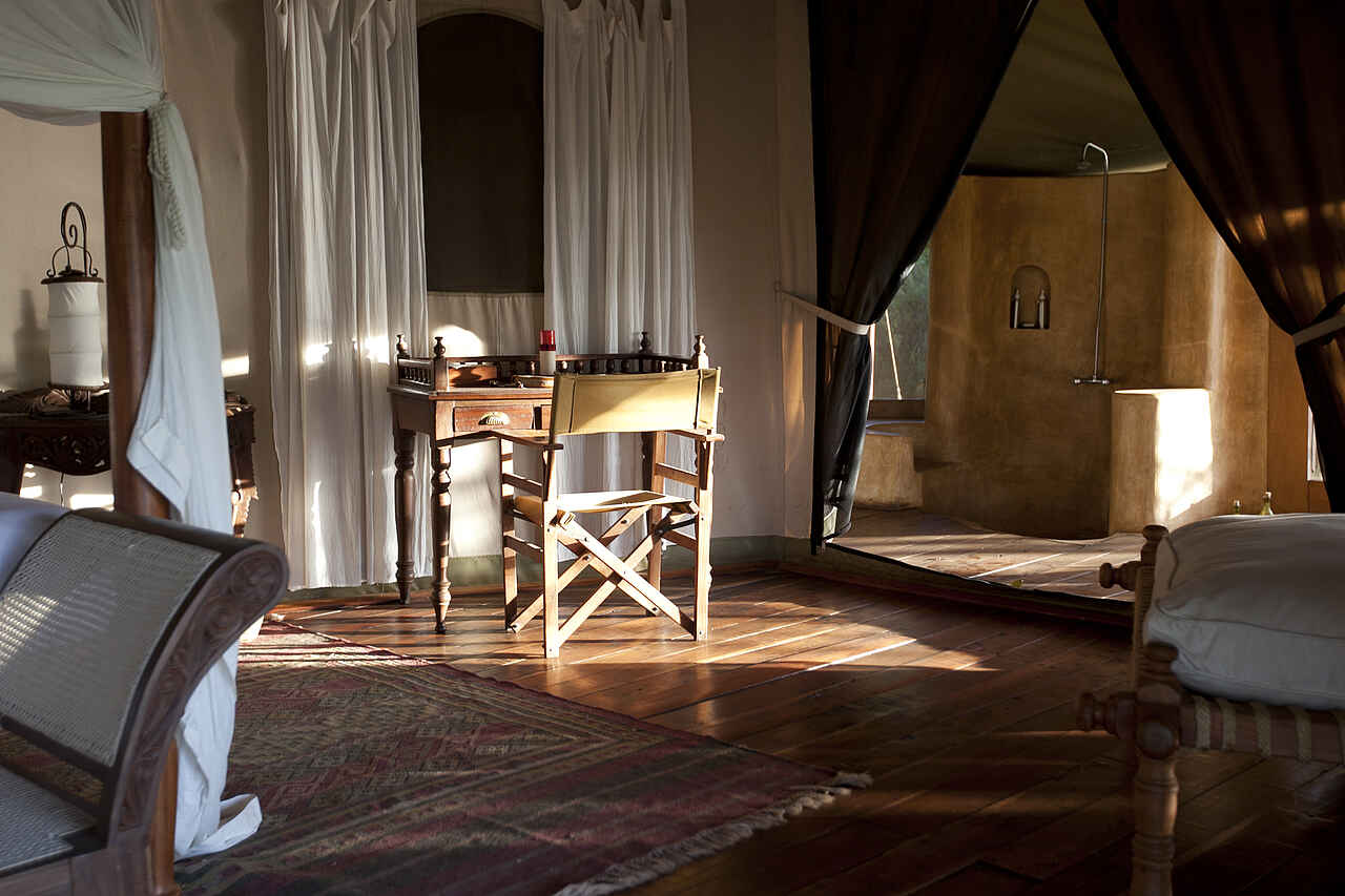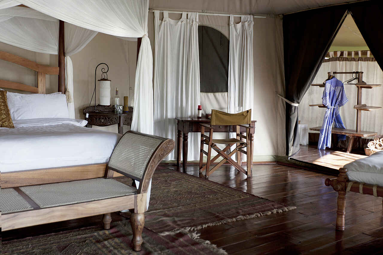 Die Gästezelte im Ngare Serian Camp sind großzügig geschnitten und klassisch eingerichtet. Hohe Stoffwände, feste Holzböden und große Fensteröffnungen sorgen für viel Tageslicht und gute Luftzirkulation. Jedes Zelt verfügt über komfortable Betten mit Moskitonetzen, Sitzgelegenheiten, Ablageflächen sowie eine Kaffee- und Teestation. Die En-suite-Badezimmer sind geräumig gestaltet und mit Waschbecken, Spültoilette, Dusche, fließendem Warmwasser, Handtüchern und Pflegeprodukten ausgestattet. Die private Veranda vor jedem Zelt bietet Raum zum Verweilen und ermöglicht ruhige Beobachtungen des Flussgeschehens.