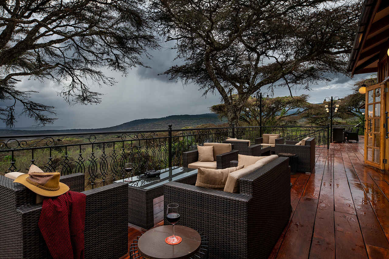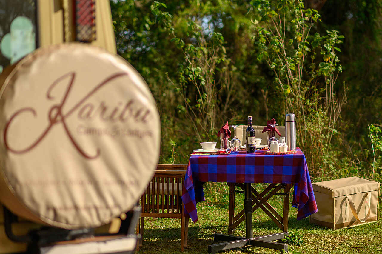 Das Herzstück des Camps ist eine offene Lounge mit Panoramablick auf die bewaldeten Hänge des Kraters. Bequeme Sofas und Sessel laden zum Entspannen ein, während der angrenzende Essbereich warme, einladende Atmosphäre schafft. Eine kleine Bar bietet eine Auswahl an Getränken und wird am Abend Treffpunkt für Gespräche über die Erlebnisse des Tages. Bei passendem Wetter werden die Mahlzeiten im Freien serviert, begleitet vom Geräusch der Natur. Strom wird über Solarenergie erzeugt, und eine Feuerstelle sorgt nach Sonnenuntergang für gemütliche Momente.