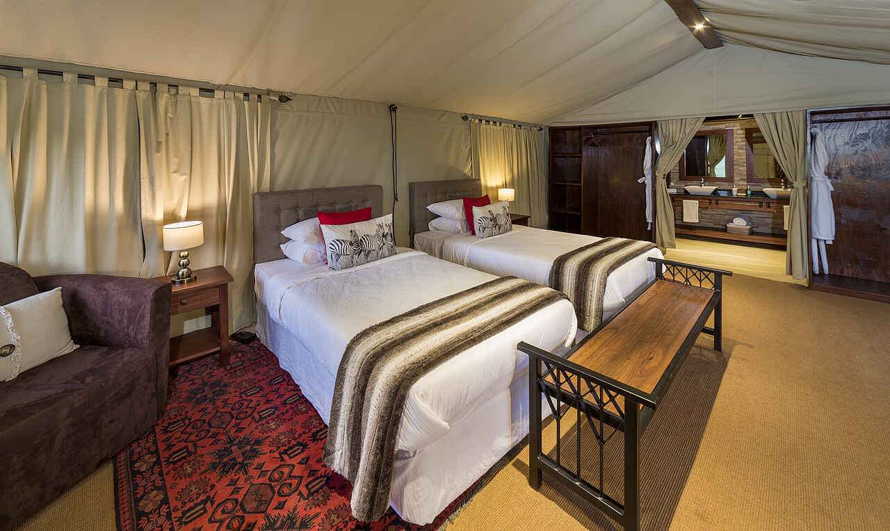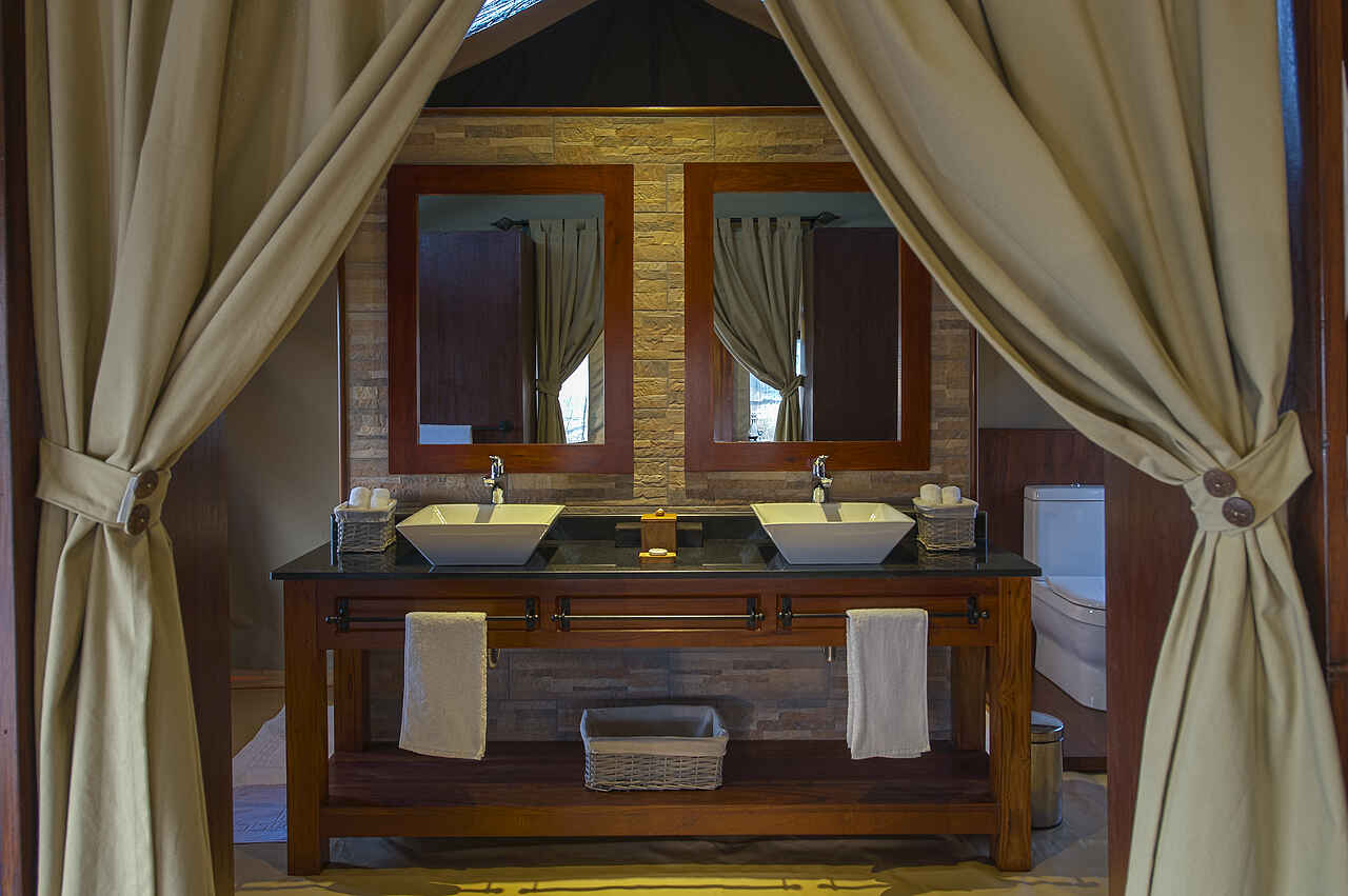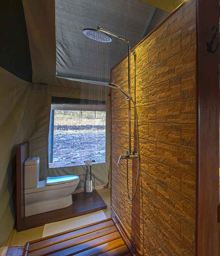 8 Meruzelte mit privater Veranda, großem Schlafraum mit Teppichen, Doppelbett, Lehnstuhl, 2 Nachttischen mit Lampe, Stromversorgung mit 220 V, offene, aber verhängbare Seitenwände, en-suite Bad mit 2 Waschbecken, Toilette, Dusche. Darüber hinaus Stehventilatoren, Moskitonetze an den Fenstern, fließend warm- und Kaltwasser, Minisafe, Taschenlampen, Funkverbindung zum Hauptzelt,, Akkulademöglichkeiten, Handtüchern, Fön Wäscheservice, kein WiFi in den Gästezelten.