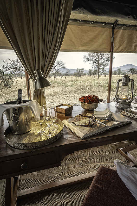 Das Camp ist klein, luxuriös und liegt sehr nahe an der Migrationsroute der Gnu- und Zebraherden.