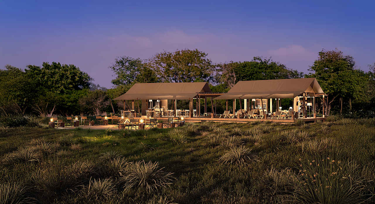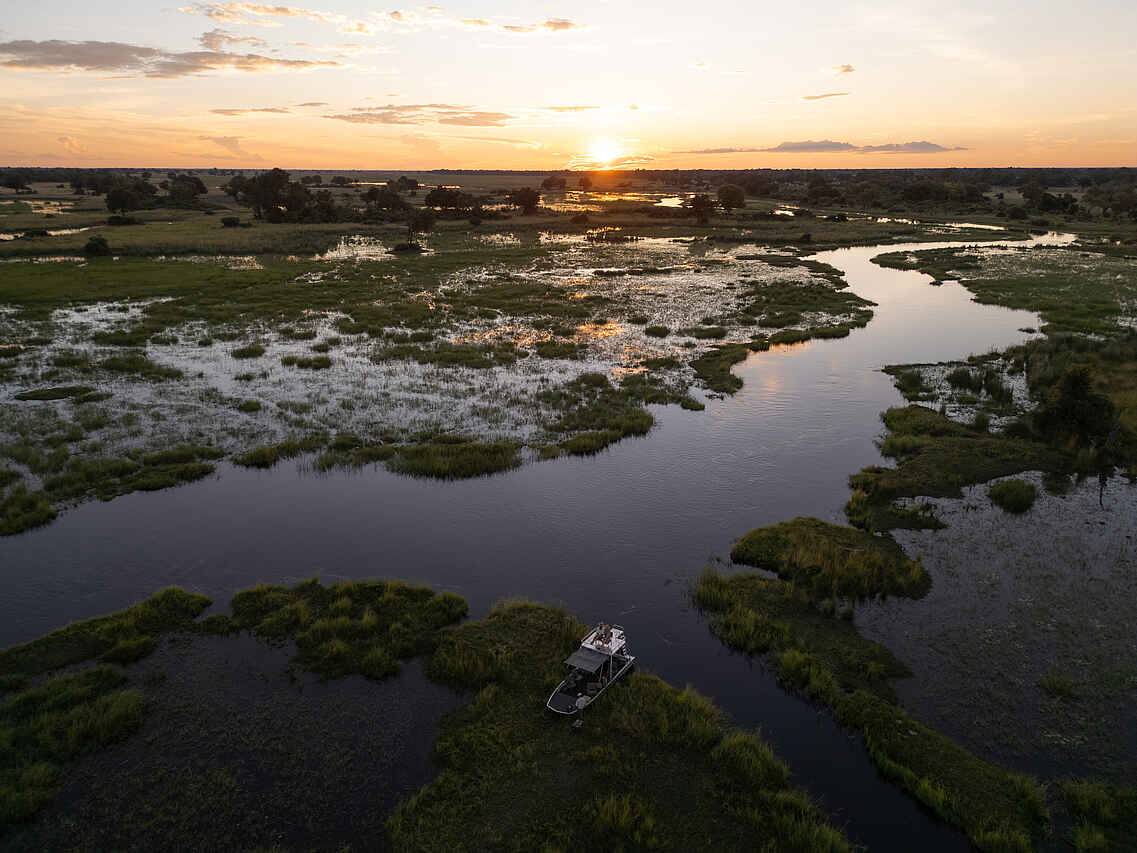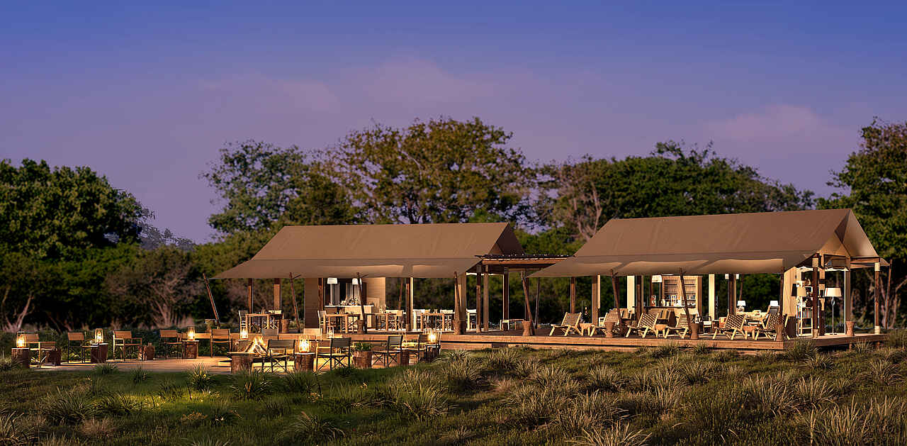Der Hauptbereich des Camps ist offen und luftig gestaltet. Ein zentraler Lounge- und Essbereich mit Reetdach und Holzboden bietet einen freien Blick auf die umliegenden Sumpf- und Flusslandschaften. Von der erhöhten Terrasse aus lassen sich oft Elefanten oder Antilopen beobachten. Gäste können sich auf gemütlichen Sofas entspannen oder den Tag am offenen Feuer ausklingen lassen. Ein kleiner Pool steht zur Abkühlung an heißen Tagen bereit. Die Atmosphäre ist entspannt und naturnah, mit stilvollen Details und durchdachter Einrichtung aus Holz und Naturmaterialien. Strom ist über Solarenergie verfügbar, WLAN steht zur Verfügung.