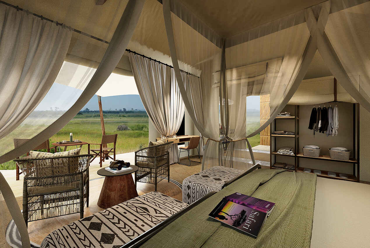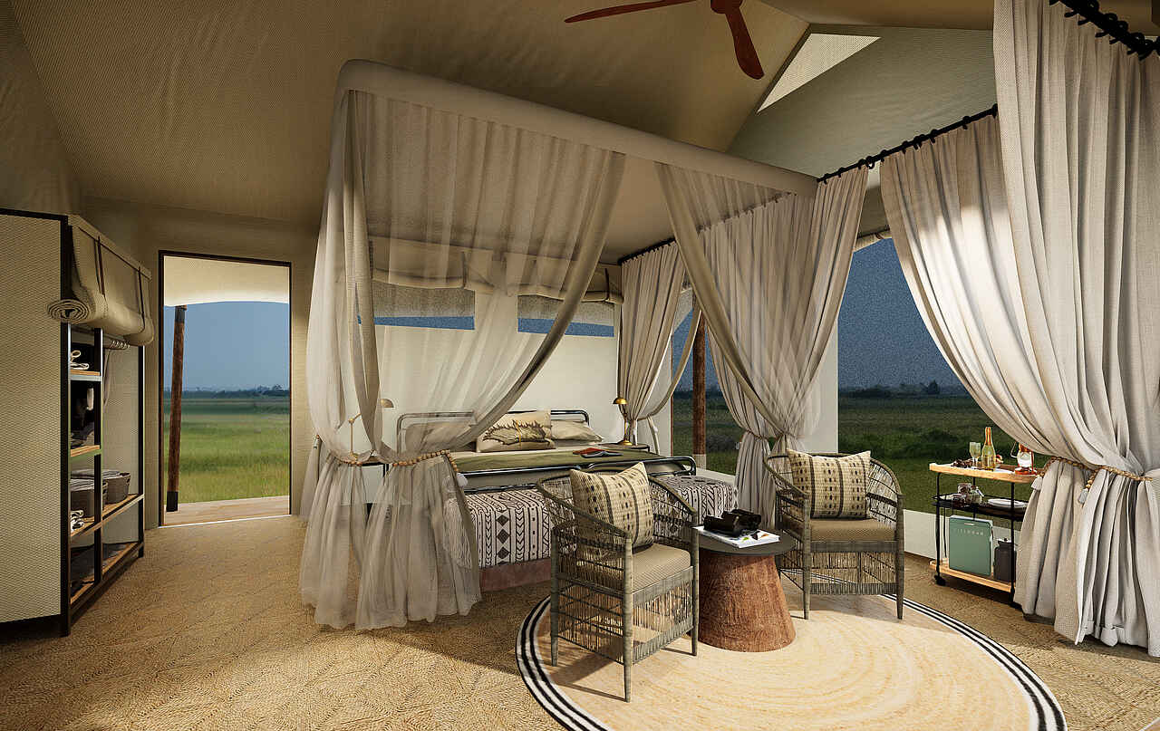 Das Safaricamp verfügt über sechs großzügige Meru-Zelte, die auf erhöhten Holzplattformen errichtet wurden. Jedes Zelt ist mit Moskitonetzen um die Betten, einem Ventilator, Nachttischen, Leselampen sowie komfortablen Sesseln auf der privaten Veranda ausgestattet. Innen schaffen warme Farbtöne, Leinenstoffe und handgefertigte Holzmöbel eine behagliche Atmosphäre. Die En-suite-Badezimmer bieten sowohl Innen- als auch Außendusche, dazu ein Waschbecken und ein WC. Eine Kaffee- und Teestation sowie Trinkwasser stehen für die Gäste bereit.