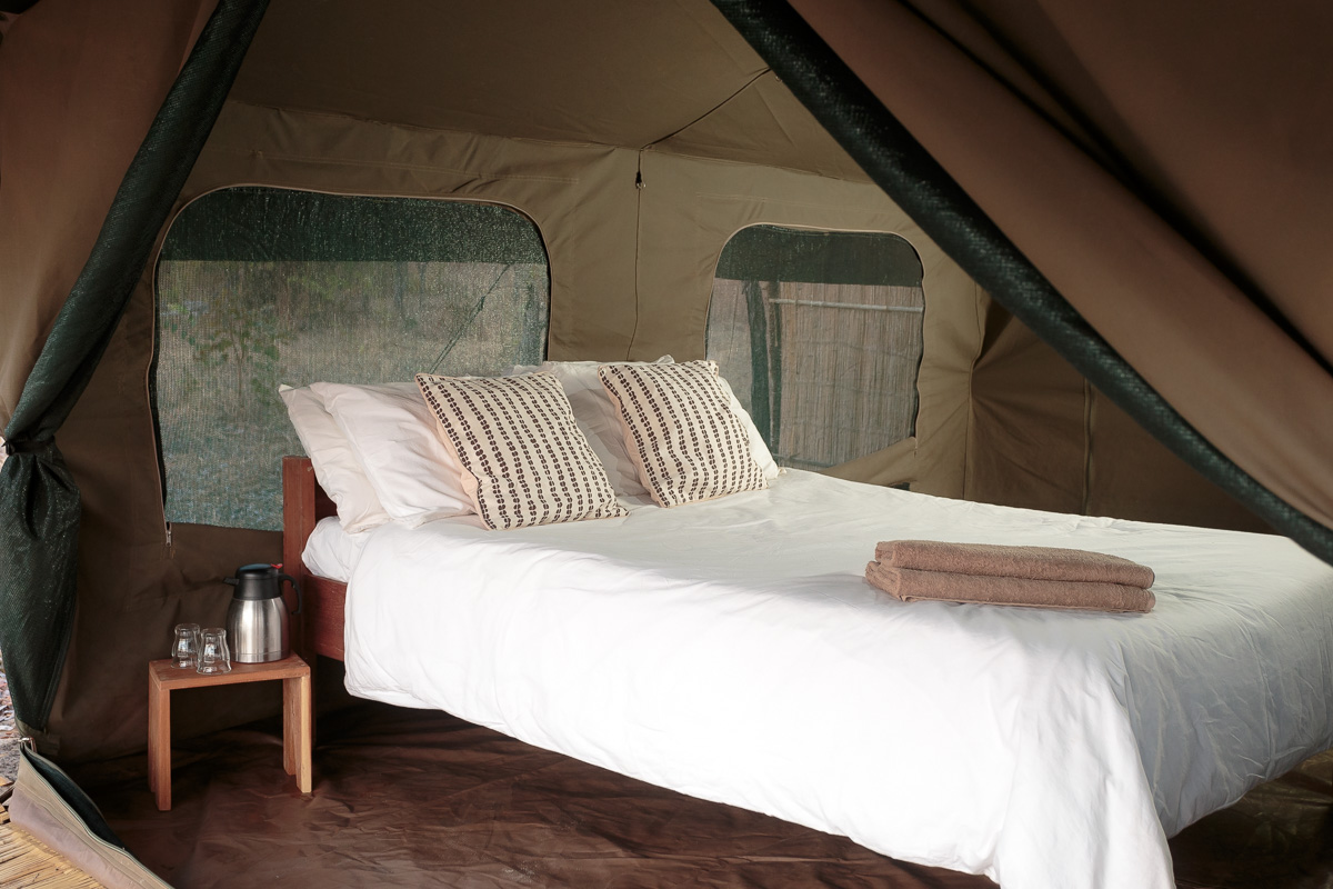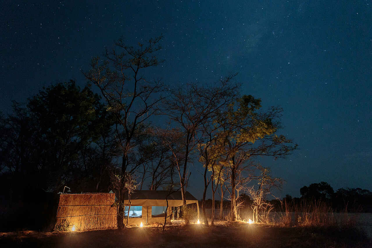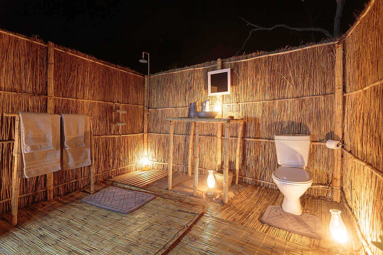 4 Gästezelte im Merustil. Weites Vordach, darunter 2 Regiesessel. Im Zelt zwei Einzelbetten oder ein Doppelbett auf einem Holzgestell. Ein Regal bietet Platz für Kleidung und Taschen. Privates Bad unter freiem Himmel, durch Reets und Schilf blickgeschützt. WC, Bucket Shower mit Warmwasser auf Anfrage, Waschtisch. Mahlzeiten werden praktisch immer im Freien, entweder unter Bäumen oder im Flussbett serviert.
