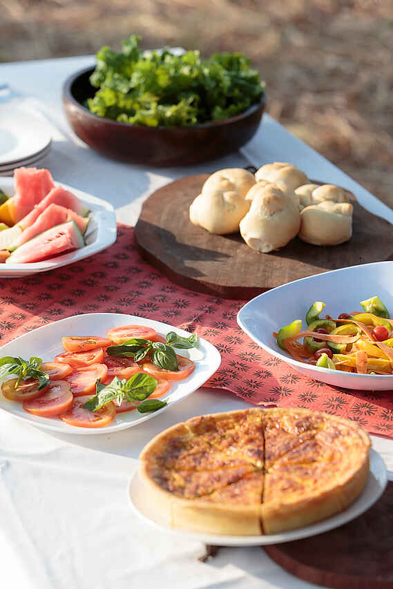 Das Camp bietet alle Mahlzeiten und Getränke, die praktisch immer unter freiem Himmel serviert werden. Die Küche ist einfach und schmackhaft, alle Gerichte werden im Camp frisch zubereitet. Frühstück vor der Morgenausfahrt. Lunch nach der Rückkehr. Dann Mittagspause bis ca. 15:30 Uhr. Kaffee und Tee vor der Nachmittagaktivität. Gemeinschaftliches Dinner bei Laternen- und Kerzenlicht nach der Rückkehr.