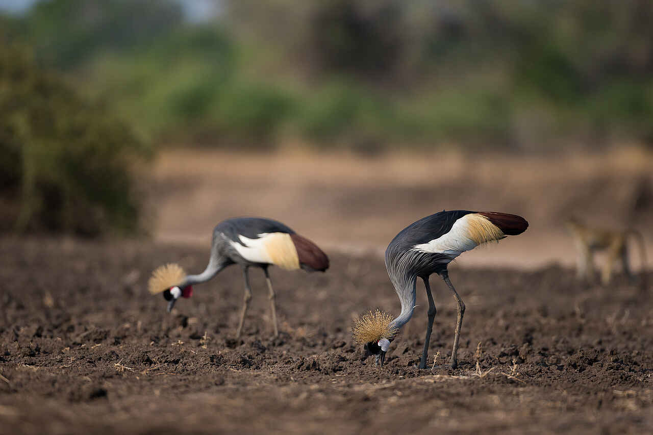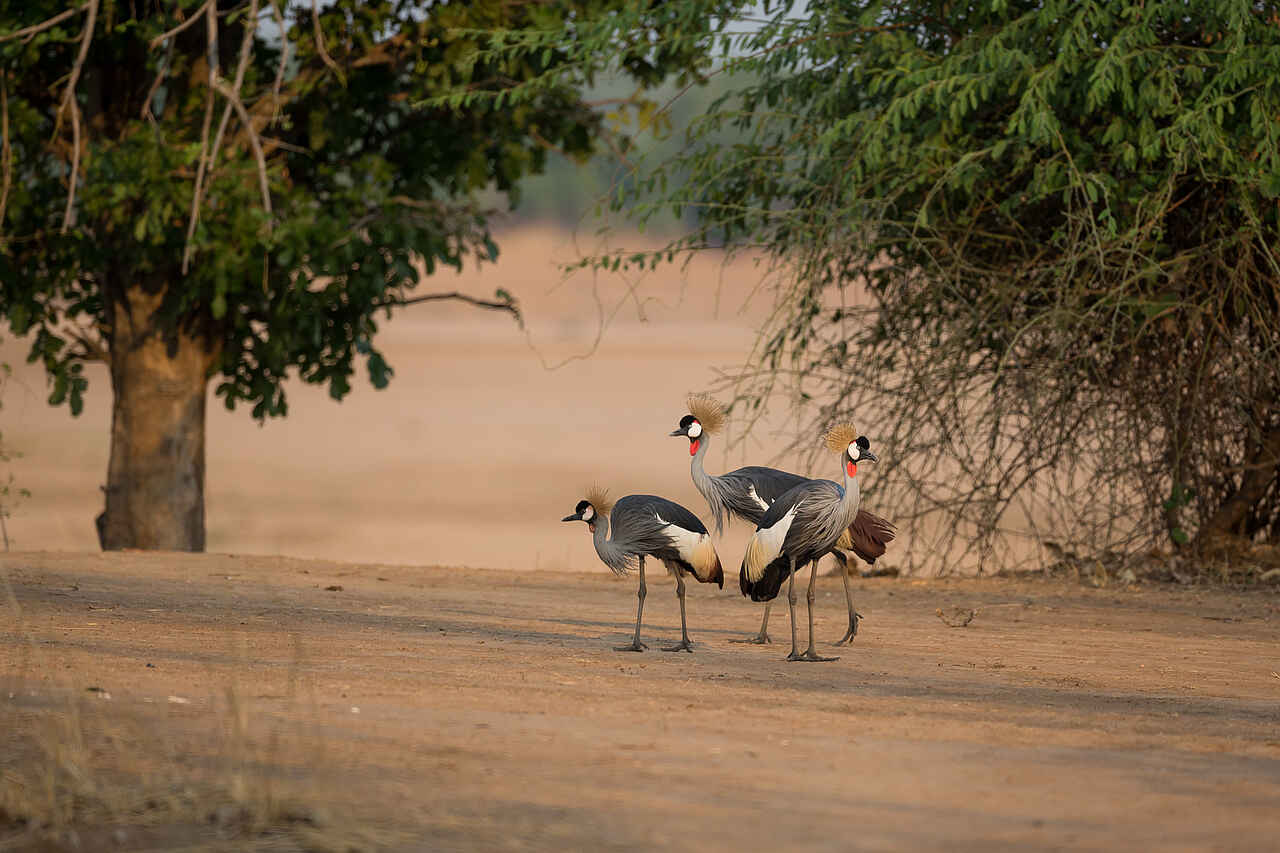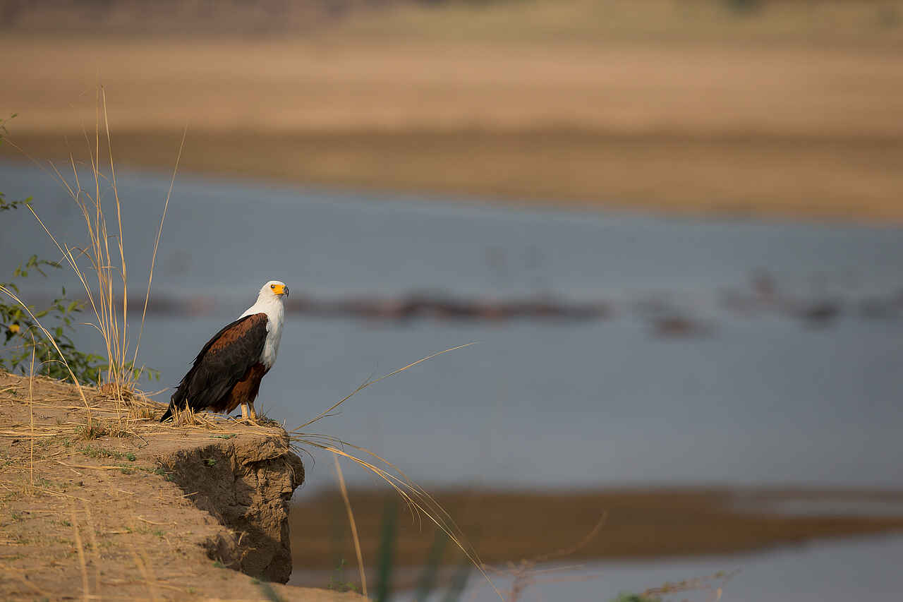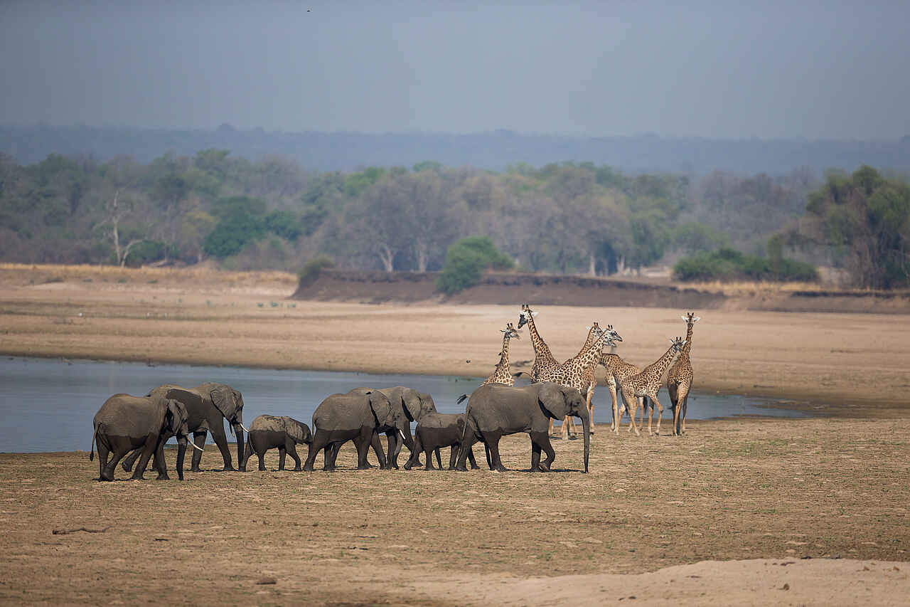 Elefanten, Büffel, Löwen, Leoparden, Hyänen, Schakale, Pukus, Impalas, Kudus, Thornycroft-Giraffen, Zebras, Buschböcke, Nilpferde und Krokodile in großer Zahl, Karminspinte, Gabelracken, Sattelstörche, Löffler, Fischadler, Geier, Paviane, Ginsterkatzen, Scrub Hares, Afrikanische Wildkatze, Lilian's Lovebird, Gänse, Enten, Nachtschwalben, Störche, Sekretäre, Eulen, Kronenkraniche