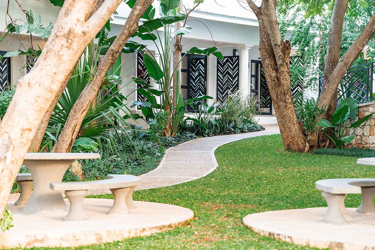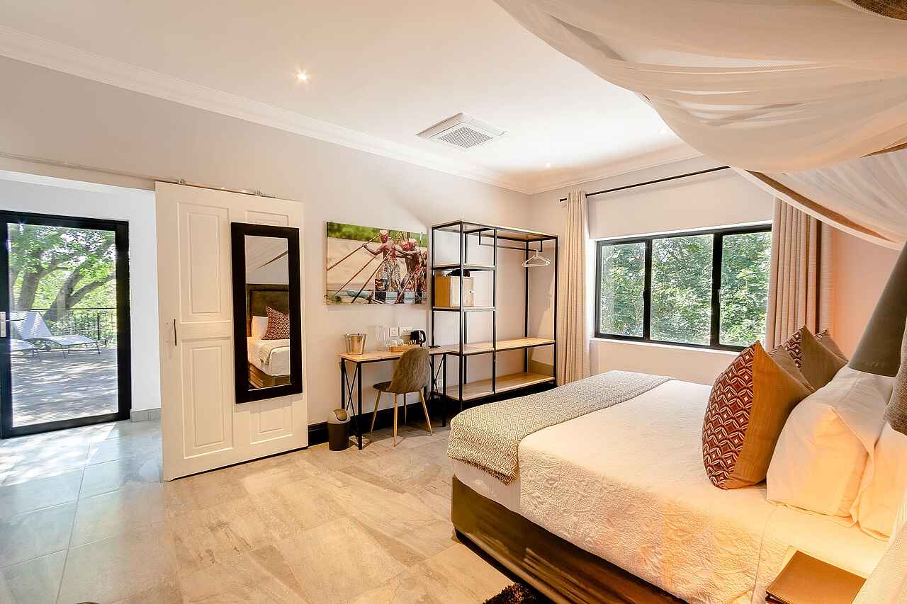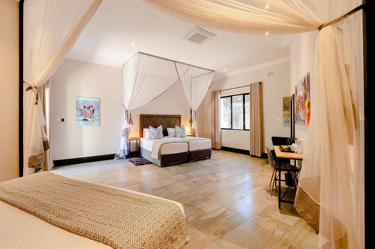 Die 24 Zimmer der Nkosi Guest Lodge sind großzügig geschnitten und stilvoll eingerichtet. Zur Ausstattung gehören bequeme King- oder Twin-Betten mit Moskitonetzen, eine Klimaanlage, ein Safe, ein Schreibtisch sowie Tee- und Kaffeezubereitungsmöglichkeiten. Die Badezimmer verfügen über Dusche und Badewanne, Handtücher, Haartrockner und hochwertige Pflegeprodukte. Einige Zimmer bieten Zugang zu einer privaten Terrasse oder einem kleinen Balkon mit Blick in den Garten. Zwei barrierefreie Zimmer sind rollstuhlgerecht ausgestattet und bieten zusätzliche Bewegungsfreiheit. Familien sind ebenfalls willkommen und können entweder nebeneinanderliegende Zimmer oder eine eigene Family-Einheit nutzen.